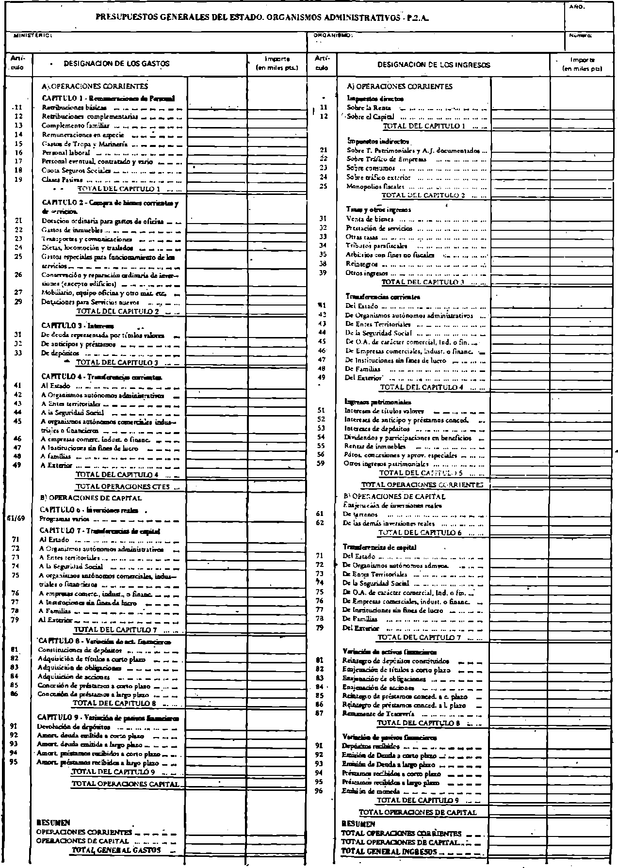 (Estos modelos, todos ellos en tamaño normalizado 429 por 313 milímetros; pueden editarse por los Departamentos u Organismos interesados, o ser solicitados de la Dirección General de Presupuestos.)