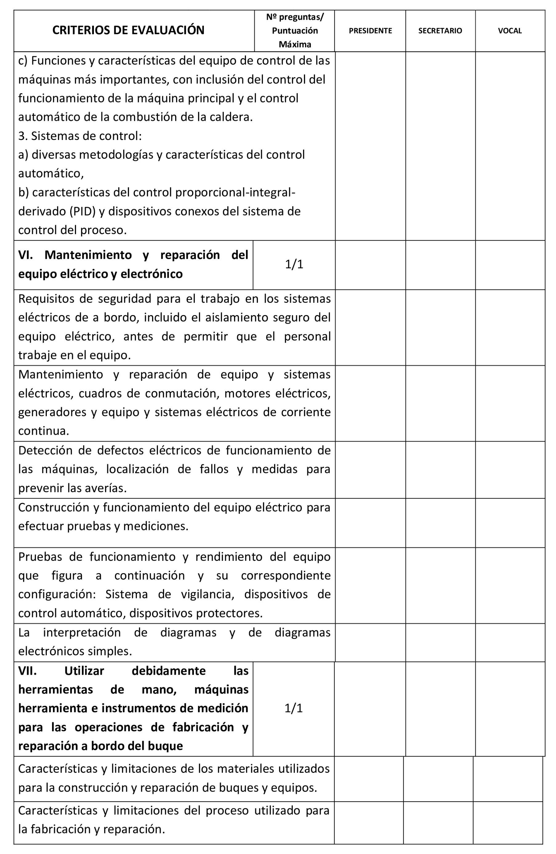 Finalizado el bloque anterior, el tribunal realizará a cada aspirante al menos una pregunta por cada una de las competencias a evaluar, establecidas en los anexos II, II, III y IV, excepto sobre la competencia de mantenimiento de una guardia de navegación, de máquinas o de radio, según corresponda, de la que se realizarán hasta tres preguntas.