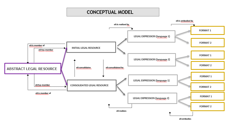 Legislation is described adapting the FRBR (Functional Requirements for Bibliographic Records) model, distinguishing different levels: