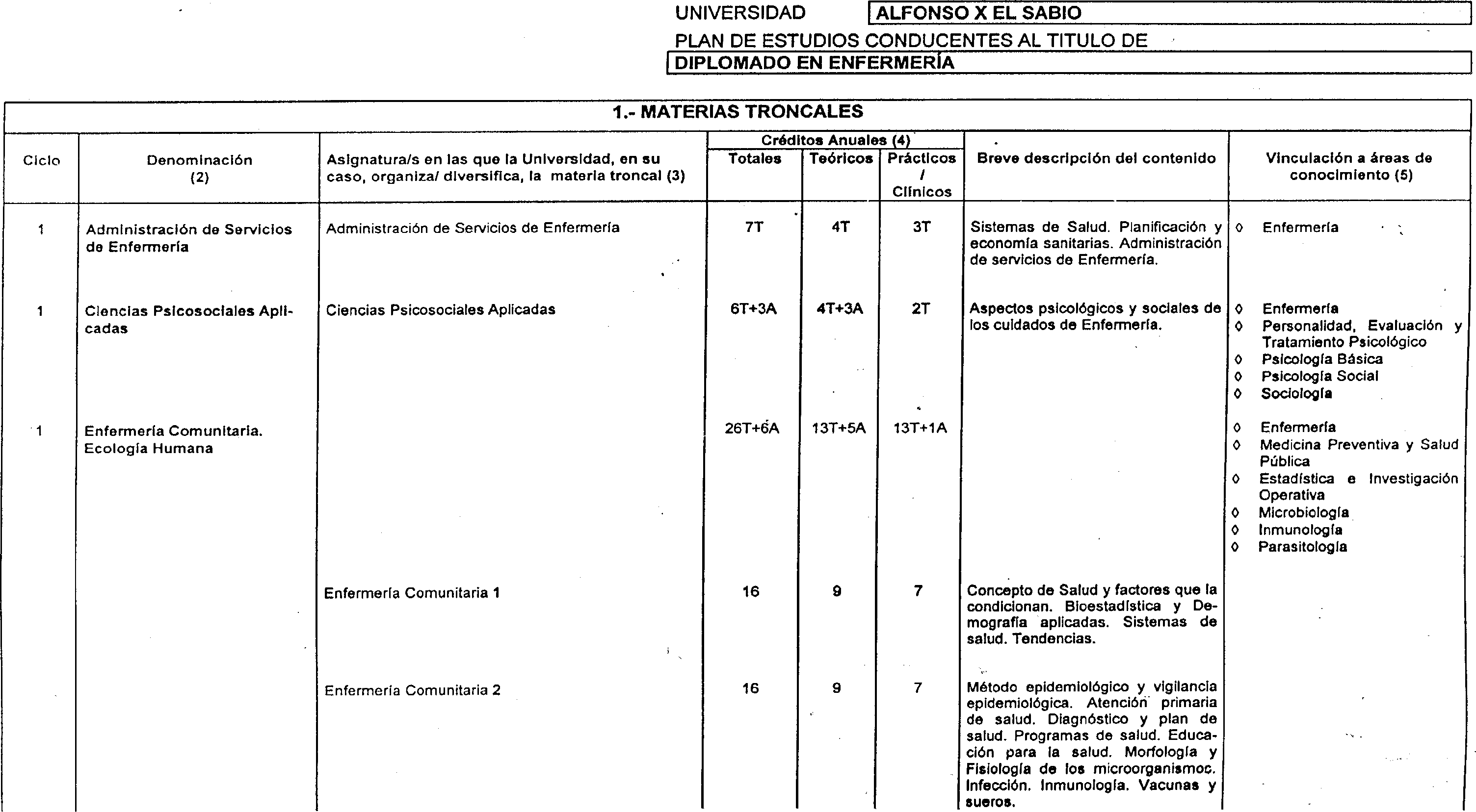 Aprobada el día 1 de diciembre de 1999 por los órganos de gobierno de la Universidad «Alfonso X el Sabio» la adaptación a la normativa vigente del plan de estudios conducente al título oficial de Diplomado en Enfermería, que se imparte en la Facultad de Ciencias de la Salud; emitido informe favorable por acuerdo de la Subcomisión de Evaluación de Ciencias Experimentales y de la Salud, en su reunión del 27 de enero de 2000, y homologado por acuerdo de la Comisión Académica del Consejo de Universidades, de fecha 16 de mayo de 2000,