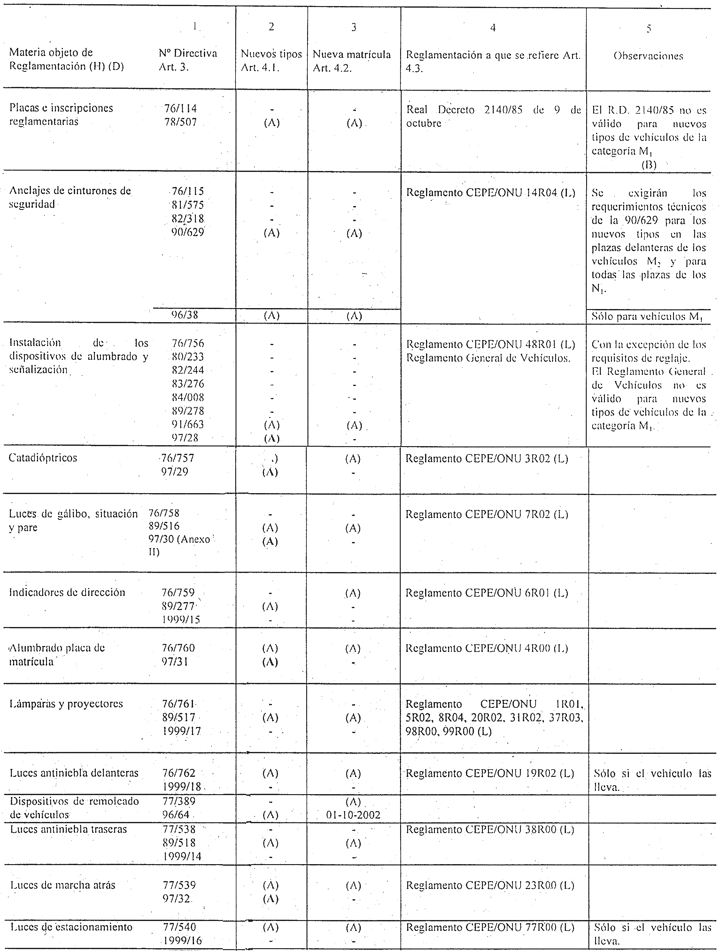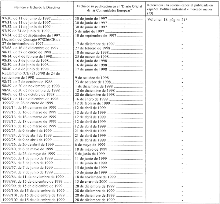 Mediante las Órdenes de 4 de febrero de 1988, 10 de abril y 24 de noviembre de 1989, 16 de julio de 1991, 24 de enero, 24 de julio, 29 de diciembre de 1992, 10 de junio, 15 de octubre de 1993, 22 de febrero de 1994, 9 de marzo de 1995, 24 de abril de 1996, 25 de abril, 9 de diciembre de 1997, 28 de julio de 1998, 17 de febrero y 14 de junio de 1999 se transpusieron las Directivas y Reglamentos CEPE/ONU aparecidos hasta la primera quincena del mes de mayo de 1999.