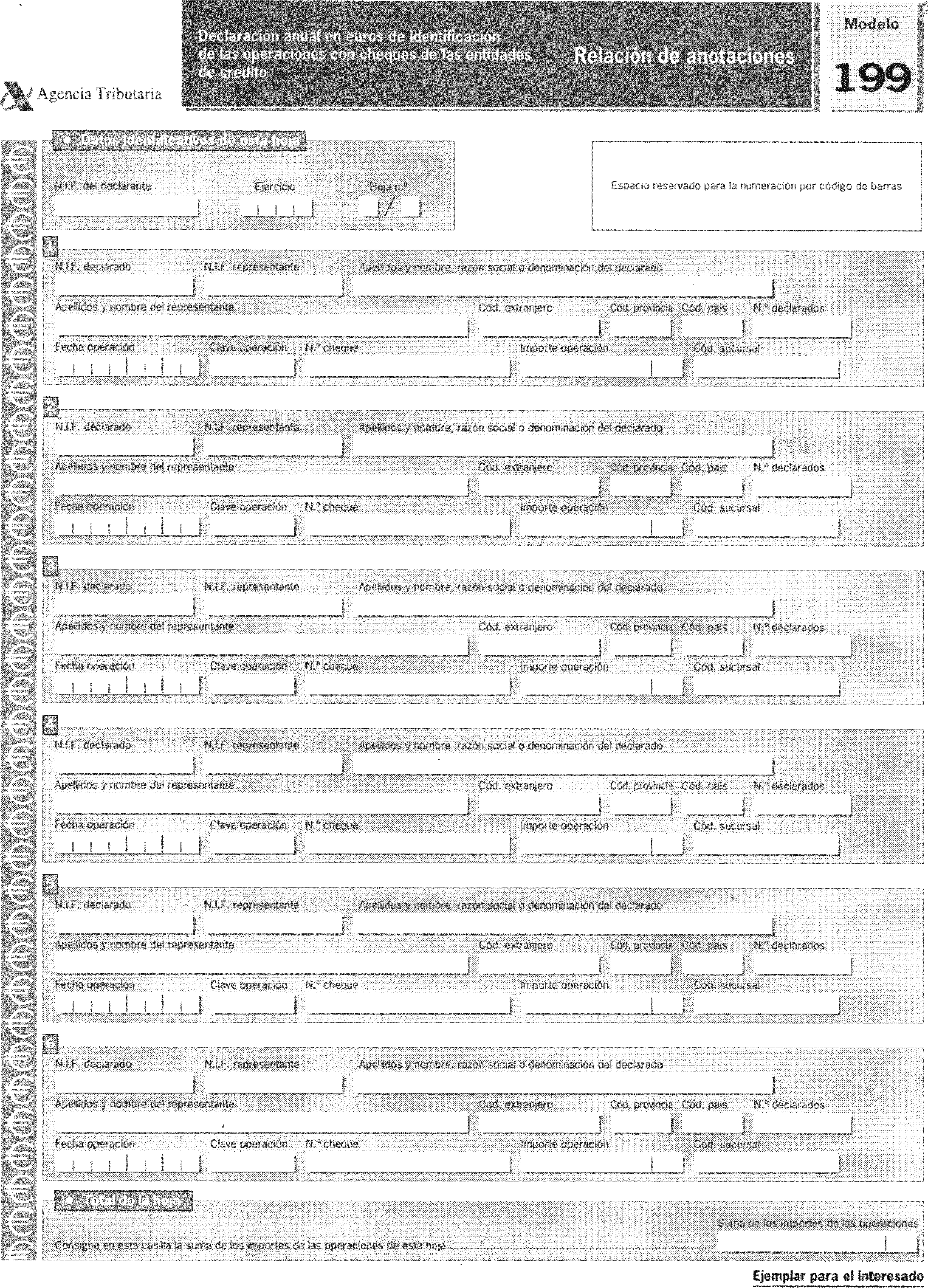 A estos efectos, se aprobó el Real Decreto 1393/1993, de 4 de agosto, por el que se modifica el artículo 15 del Real Decreto 338/1990, de 9 de marzo, por el que se regula la composición y la forma de utilización del número de identificación fiscal («Boletín Oficial del Estado» del 31), en cuyo apartado 9 se establece la forma en que las entidades de crédito deben comunicar a la Administración tributaria la información relativa a los cheques que libren, con excepción de los librados contra una cuenta bancaria, y los cheques que abonen en efectivo, y no en cuenta bancaria, y que hubieran sido emitidos por una entidad de crédito o que, habiendo sido librados por personas distintas, tuvieran un valor facial superior a 3.005,06 euros. En este sentido, la Orden de 28 de diciembre de 1993 («Boletín Oficial del Estado» del 31) aprobó el modelo 199 de «Identificación de las operaciones de las Entidades de Crédito (artículo 15 del Real Dcreto 338/1990). Declaración anual», así como los diseños físicos y lógicos para su presentación en soporte directamente legible por ordenador.