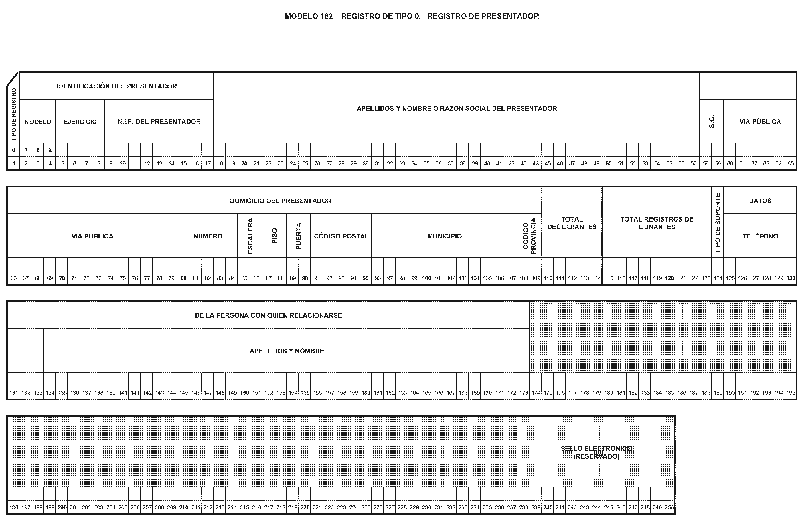 1. Los dos ejemplares, para la Administración y para el interesado, de la hoja-resumen correspondiente al presentador, modelo 182, debidamente firmados y en los que se habrán hecho constar los datos de identificación de la persona o entidad que actúe como presentadora, los relativos al número total de declarantes y al número total de donantes relacionados, así como el ejercicio y la casilla indicativa del tipo de presentación en los espacios correspondientes. No serán cumplimentados los restantes datos solicitados en la hoja-resumen del modelo 182 correspondiente al presentador.