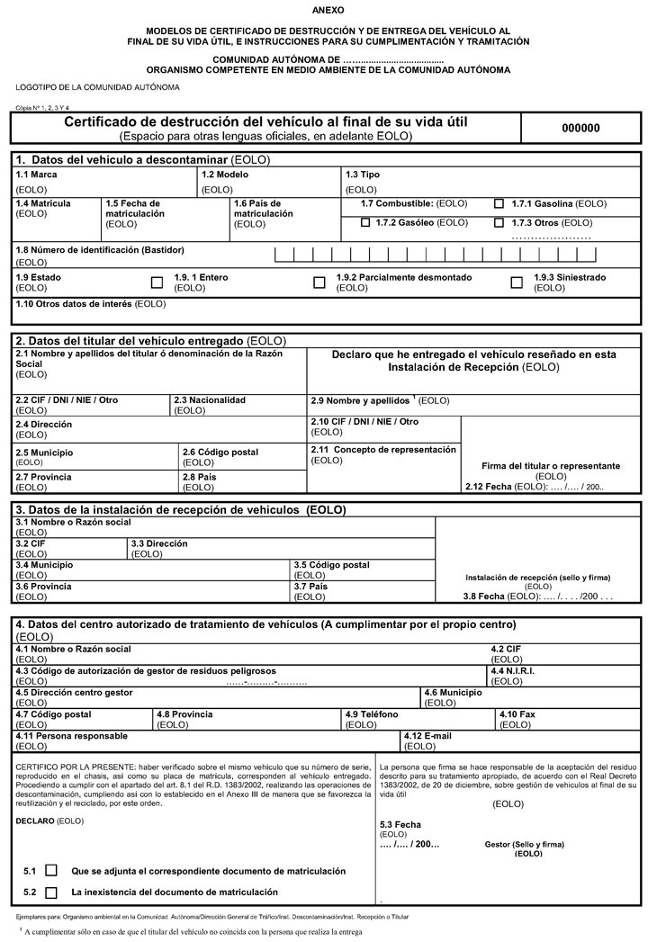 Este certificado constará de cinco páginas en papel autocalco: cuatro para el Certificado de Destrucción y, una quinta, diferente, para el Certificado de Entrega. La quinta copia no será autocalco para el apartado «Datos del centro autorizado de tratamiento de vehículos».