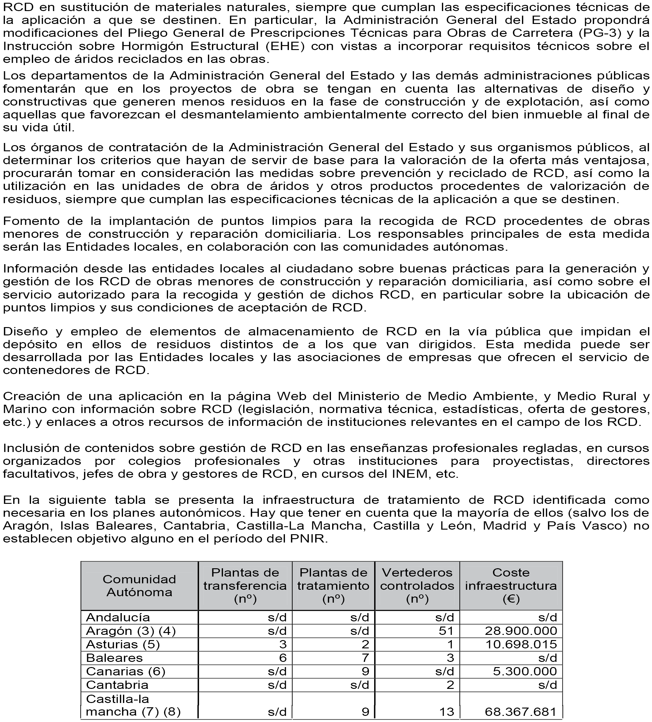 Todas las medidas y actuaciones previstas en este Plan serán financiadas por las Administraciones competentes; existiendo, dentro de la Administración General del Estado, una dotación presupuestaria de 23 millones de euros en el presupuesto del Ministerio de Medio Ambiente, y Medio Rural y Marino, que se destinará a promover actuaciones de interés general para el adecuado desarrollo de la política de gestión de residuos.