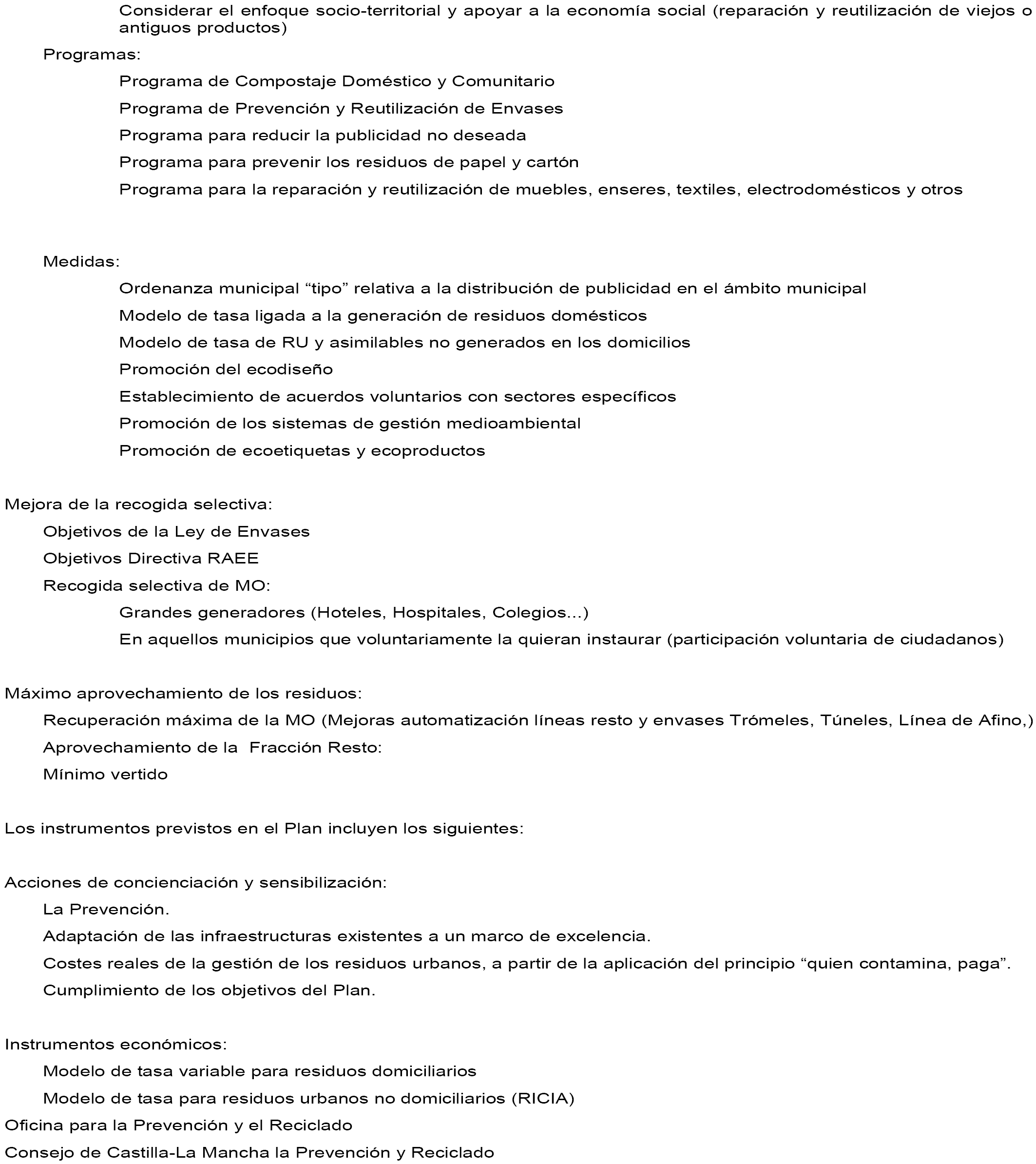 Este Plan incluye entre sus objetivos el tratamiento de los residuos domésticos y similares (urbanos de de origen domiciliario), los residuos con legislación específica (peligrosos, vehículos y neumáticos fuera de uso, pilas y acumuladores, aparatos eléctricos y electrónicos, residuos de construcción y demolición, y lodos de depuradoras), suelos contaminados y residuos agrarios e industriales no peligrosos. También contempla la reducción de vertidos de residuos biodegradables.