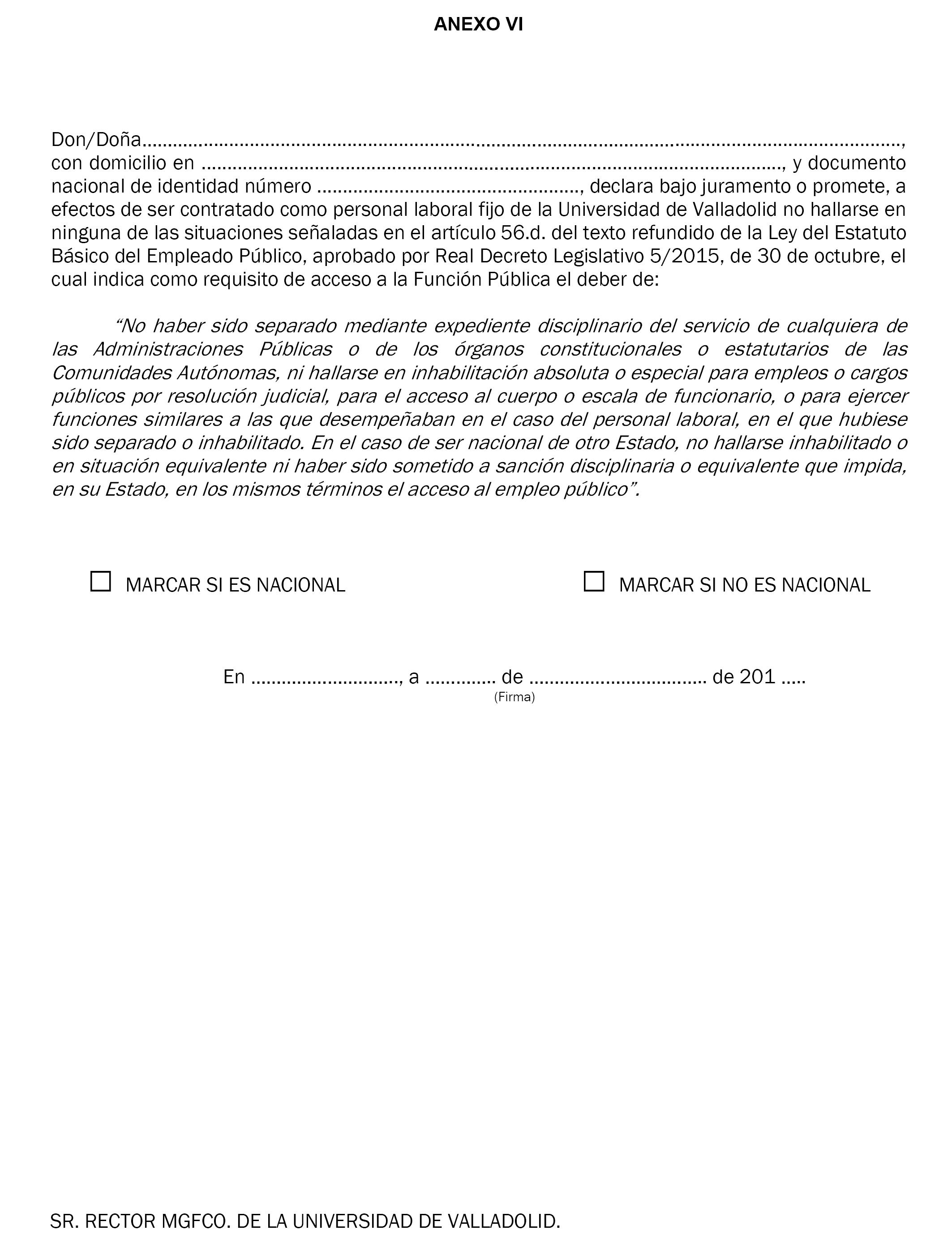 5. Habilitación: No haber sido separado mediante expediente disciplinario del servicio de cualquiera de las Administraciones Públicas o de los órganos constitucionales o estatutarios de las Comunidades Autónomas, ni hallarse en inhabilitación absoluta o especial para empleos o cargos públicos por resolución judicial, para el acceso al cuerpo o escala de funcionario, o para ejercer funciones similares a las que desempeñaban en el caso del personal laboral, en el que hubiese sido separado o inhabilitado. En el caso de ser nacional de otro Estado, no hallarse inhabilitado o en situación equivalente ni haber sido sometido a sanción disciplinaria o equivalente que impida, en su Estado, en los mismos términos el acceso al empleo público.