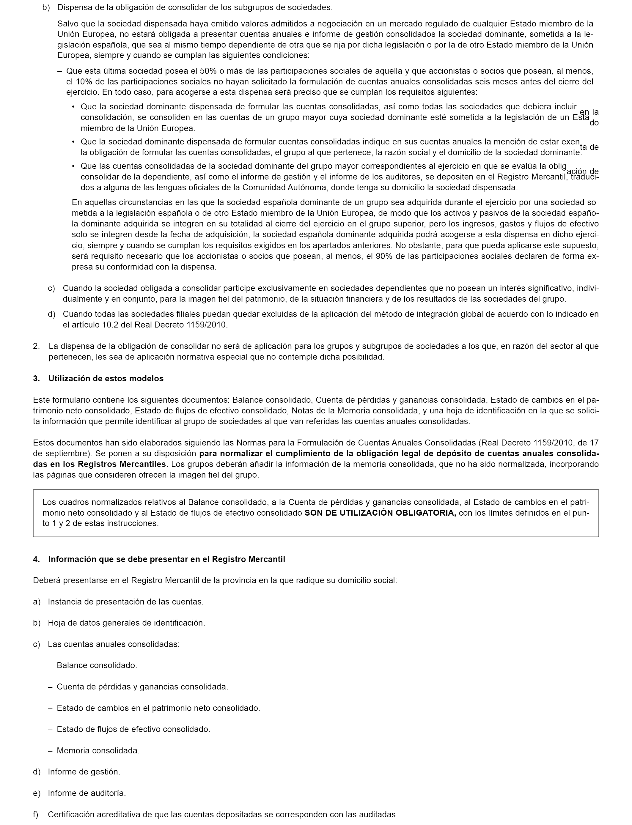 1. El modelo establecido en el anexo I de la presente orden es obligatorio para presentar en el Registro Mercantil las cuentas anuales consolidadas de toda sociedad dominante si, a la fecha de cierre del ejercicio ninguna de las sociedades del grupo ha emitido valores admitidos a cotización en un mercado regulado de cualquier Estado miembro de la Unión Europea, y opta por formular sus cuentas aplicando las normas de consolidación contenidas en el Real Decreto 1159/2010, de 17 de septiembre, modificado por el Real Decreto 602/2016, de 2 de diciembre, por el que se modifican el Plan General de Contabilidad aprobado por el Real Decreto 1514/2007, de 16 de noviembre, el Plan General de Contabilidad de Pequeñas y Medianas Empresas, aprobado por el Real Decreto 1515/2007, de 16 de noviembre, las Normas para la Formulación de Cuentas Anuales Consolidadas, aprobadas por el Real Decreto 1159/2010, de 17 de septiembre, y las Normas de Adaptación del Plan General de Contabilidad a las entidades sin fines lucrativos, aprobadas por el Real Decreto 1491/2011, de 24 de octubre.