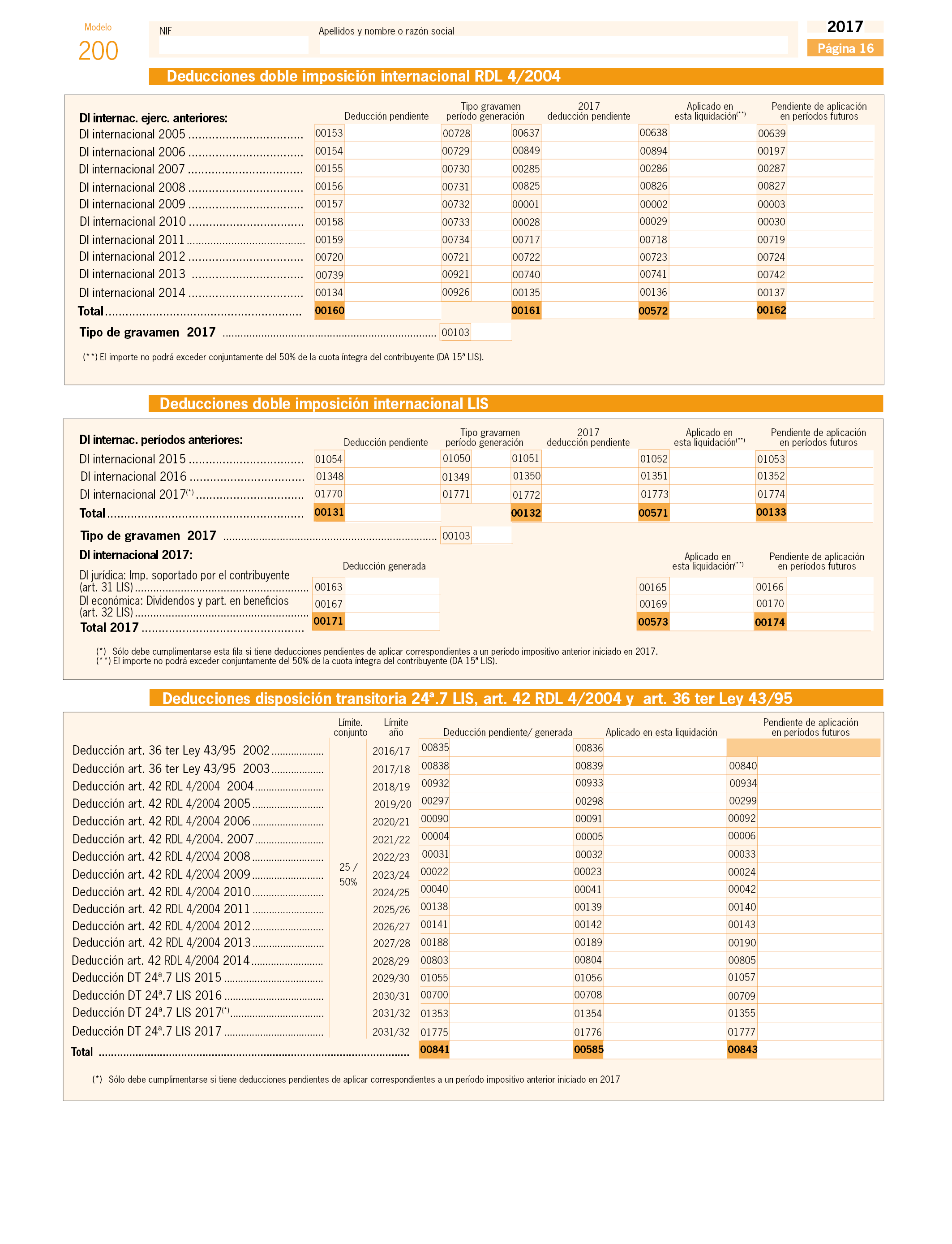 b) Deducción por actividades de investigación y desarrollo e innovación tecnológica (artículo 35 de la Ley 27/2014 correspondiente a la casilla 00798 y 00096 de la página 17 del modelo de declaración): se deberán identificar las inversiones y gastos que originan el derecho a la deducción.