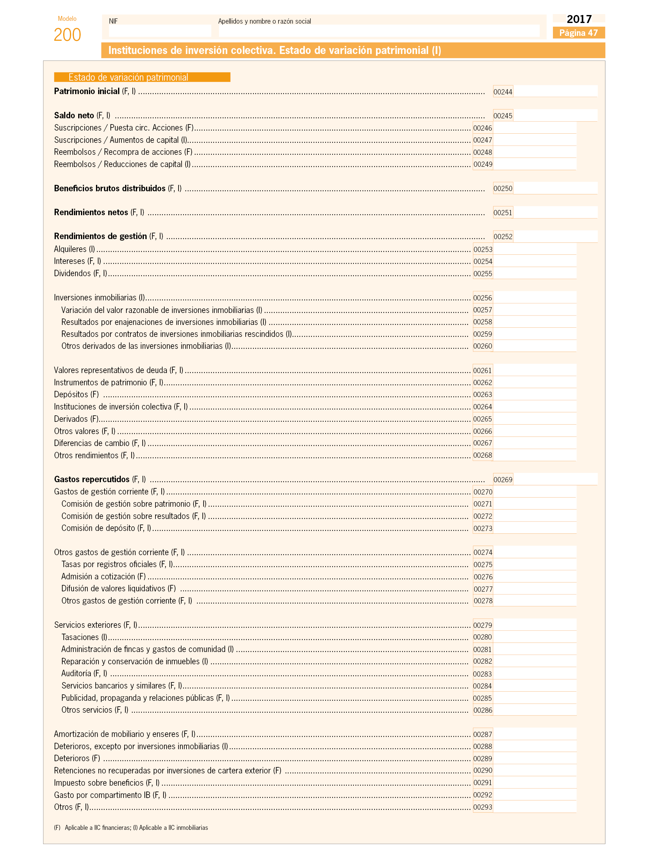 En relación con las instituciones de inversión colectiva, tanto financieras como inmobiliarias, se atenderá a lo previsto en la Circular 3/2008, de 11 de septiembre, de la Comisión Nacional del Mercado de Valores, sobre normas contables, cuentas anuales y estados de información reservada de las instituciones de inversión colectiva. Por consiguiente, estas instituciones también cumplimentarán los datos relativos al balance, cuenta de pérdidas y ganancias y estado de cambios en el patrimonio neto, en un apartado específico en sustitución de los que se incluyen con carácter general.