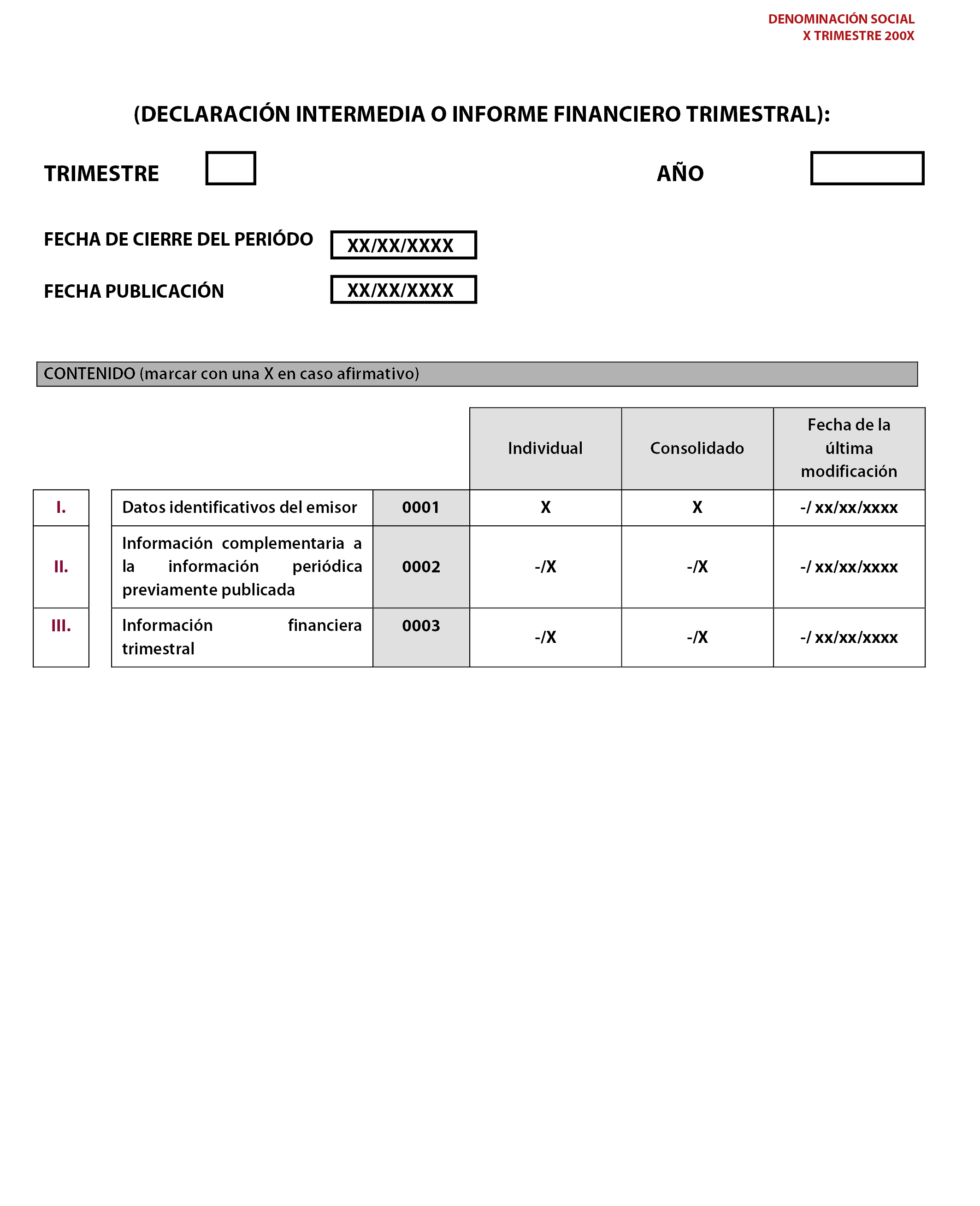 – Este modelo será de aplicación a todas las entidades obligadas a remitir la declaración intermedia o que voluntariamente publiquen un informe financiero trimestral según el artículo 120 del Texto Refundido de la Ley del Mercado de Valores.