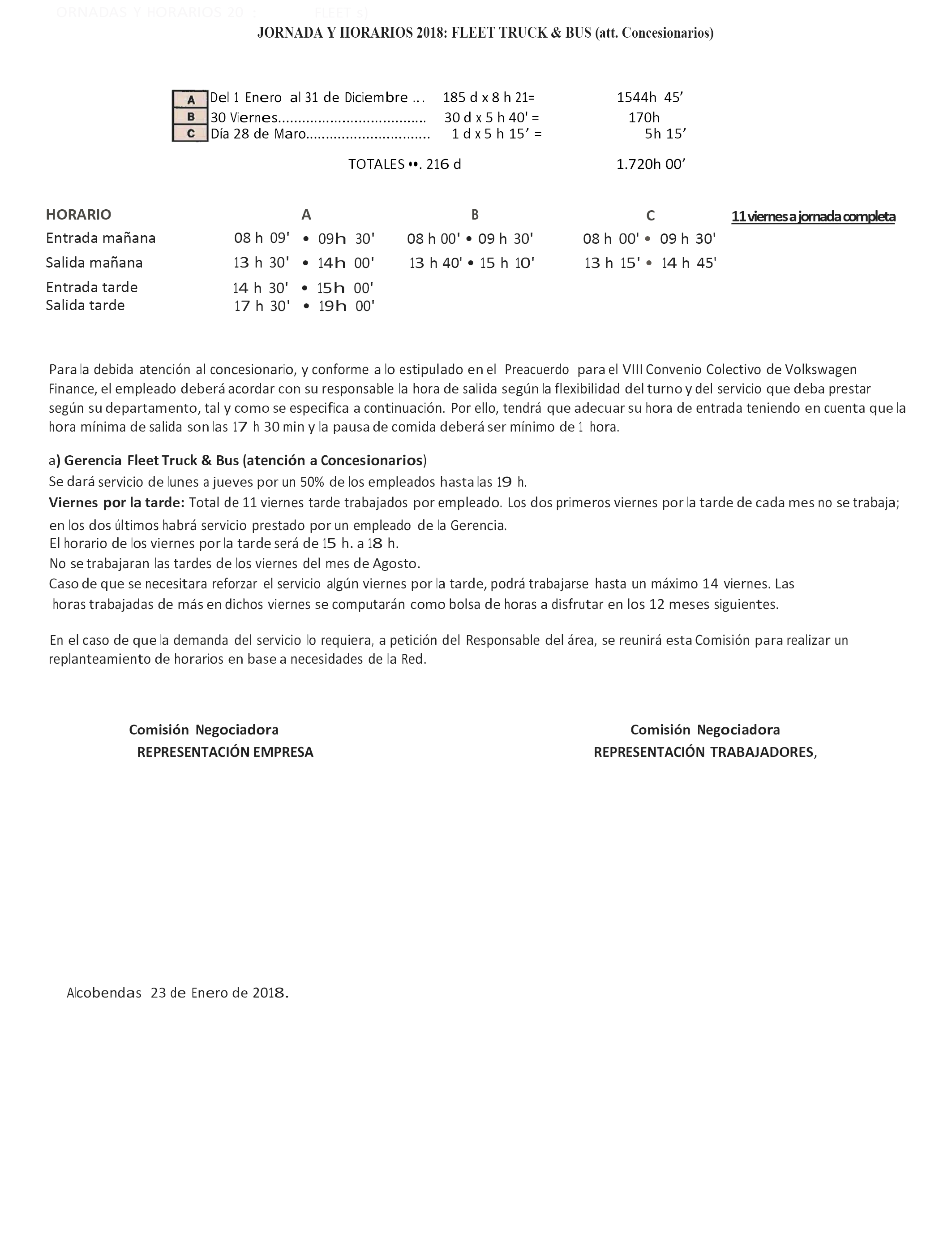 Actual horario comercial de atención a concesionarios: La reducción de una hora se ofrecería por la empresa al inicio o al final de la jornada.