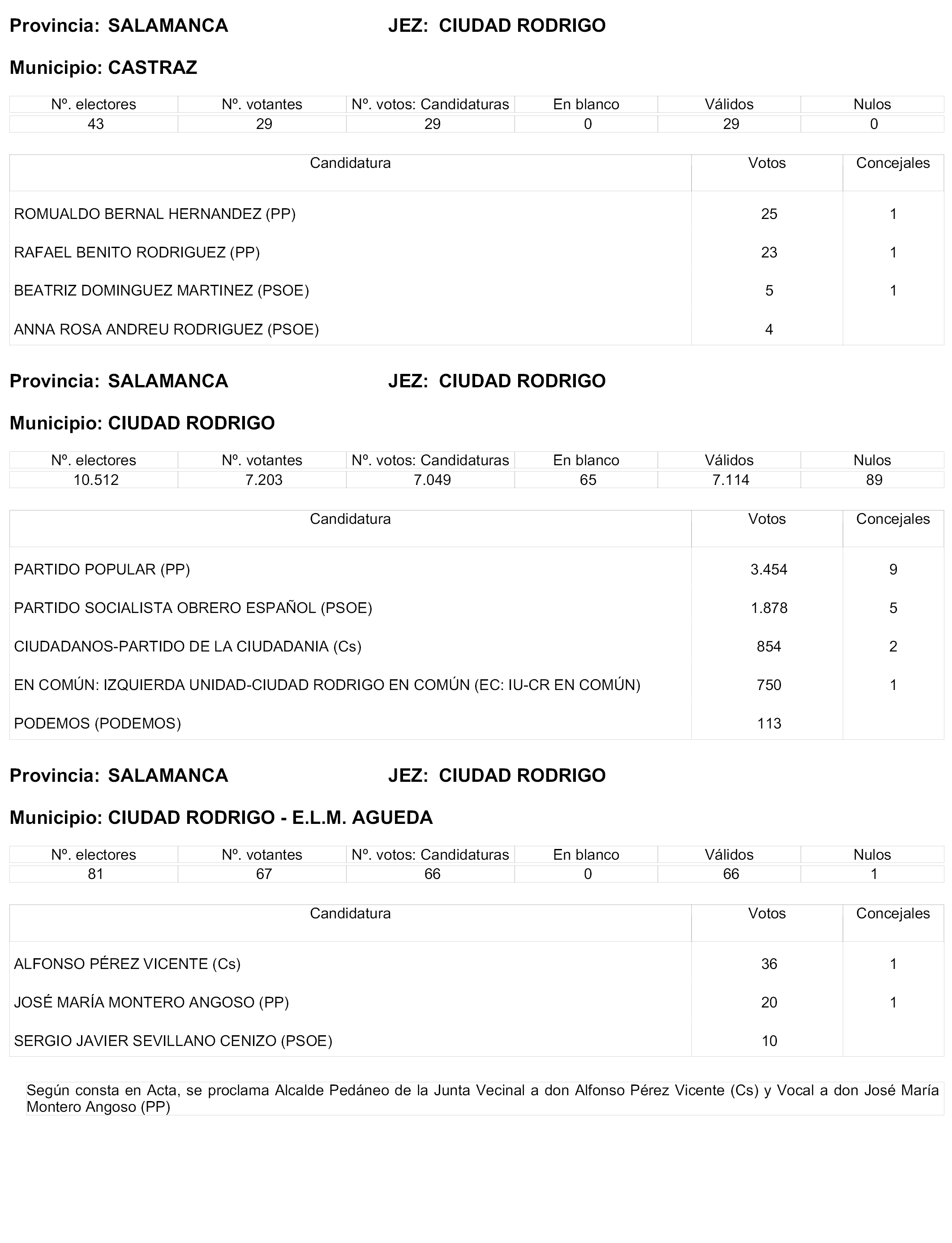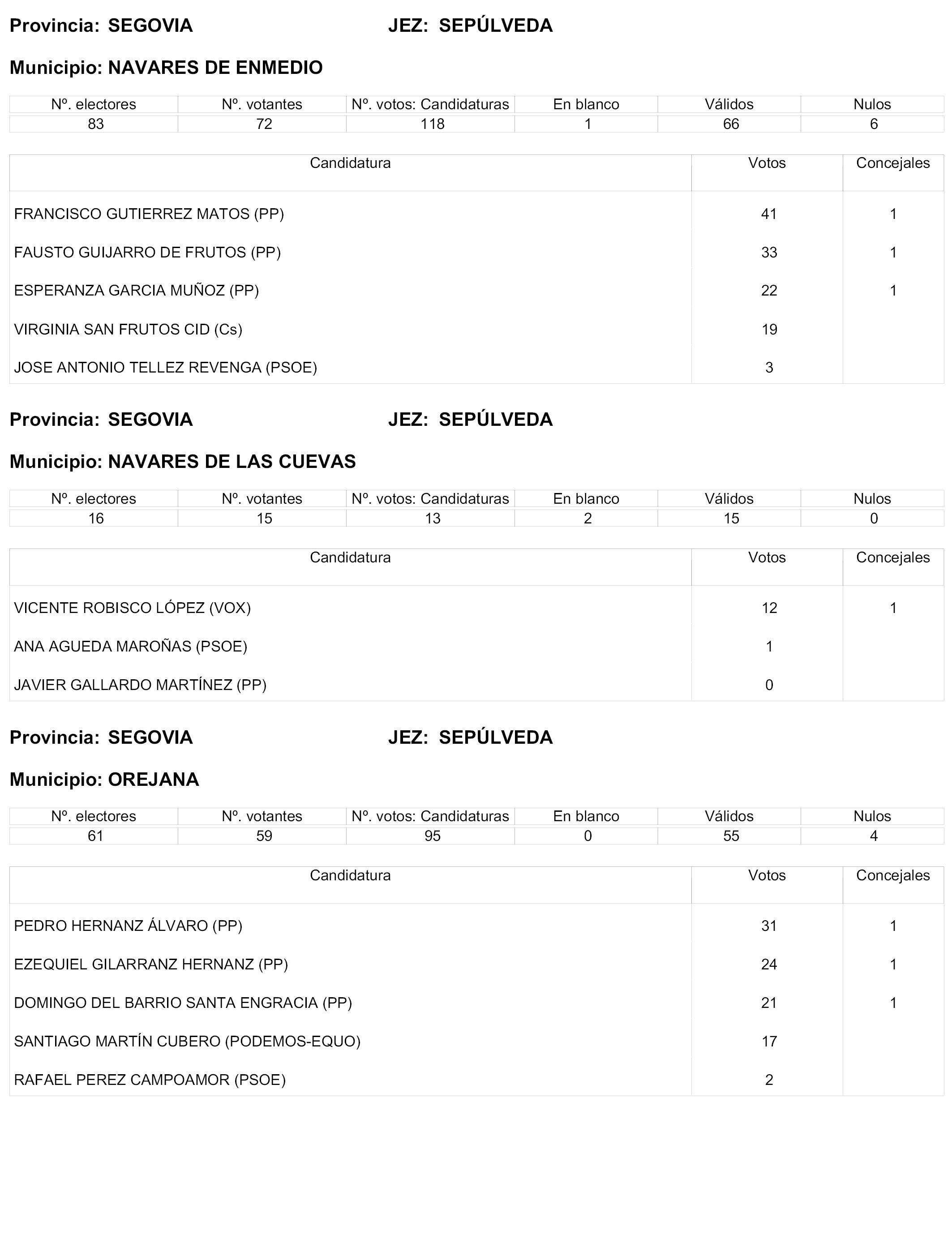 Respecto de cada municipio, y siguiendo el orden alfabético de provincias y dentro de ellas el mismo orden por Juntas Electorales de Zona, se especifica –de acuerdo con las actas de proclamación de electos por estas Juntas remitidas a la Central– el número de electores, el de votantes, el de votos a candidaturas, en blanco, válidos y nulos, y, por último, los votos obtenidos por cada candidatura y, en su caso, los Concejales electos.