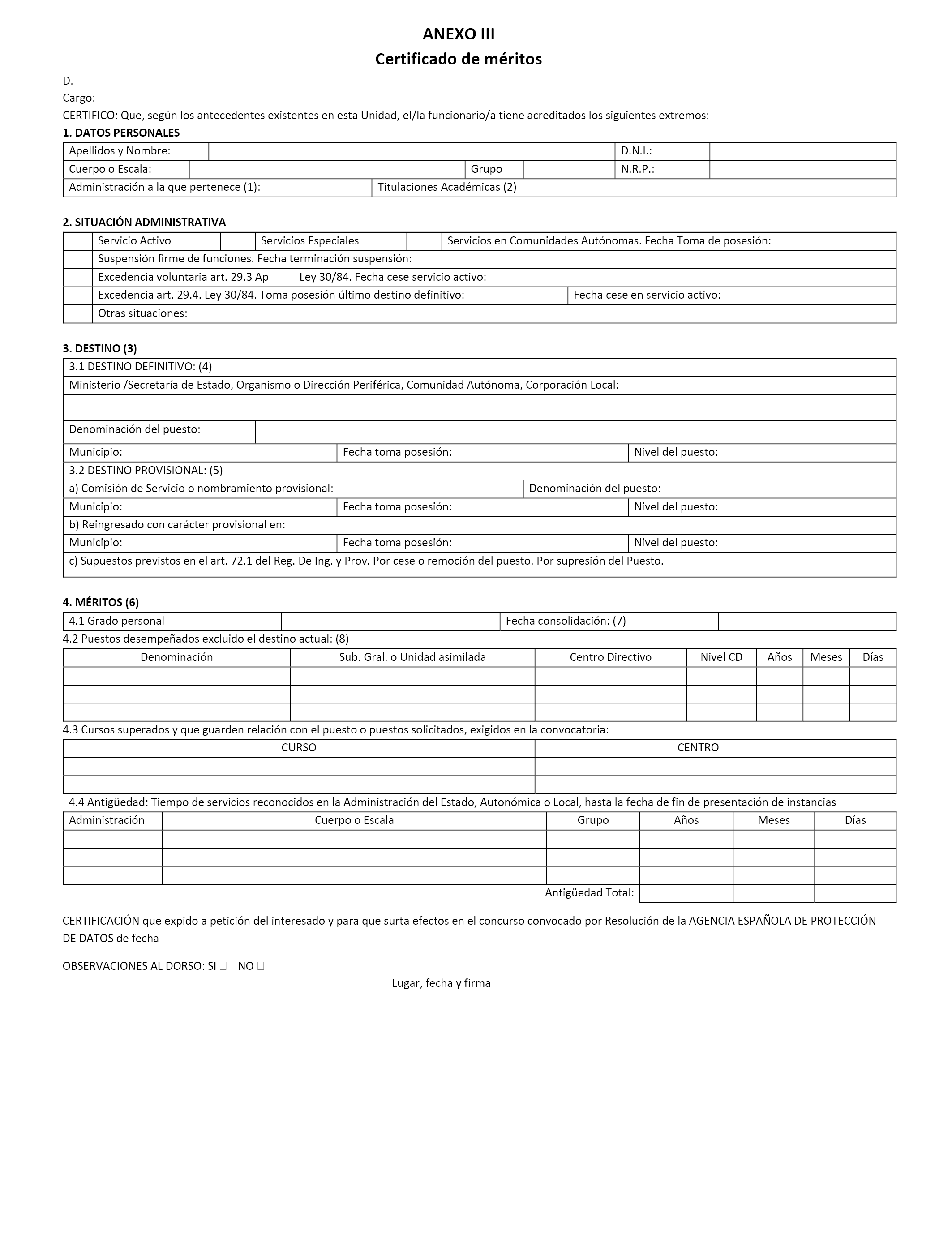 El anexo III de esta Resolución, recogerá aquellos méritos, requisitos y datos imprescindibles que en él se señalan y deberá ser expedido por: