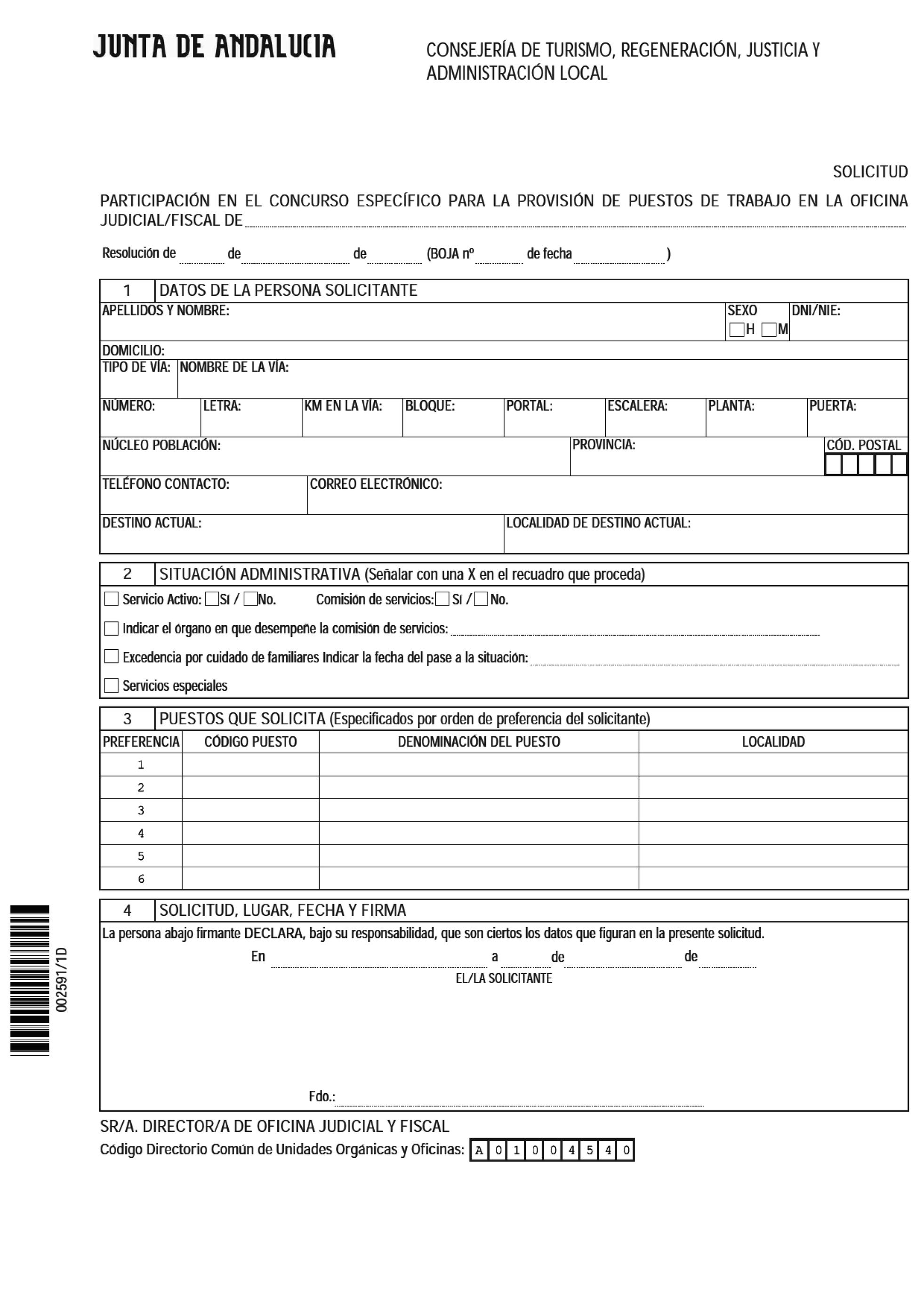 De acuerdo con lo dispuesto en la disposición transitoria cuarta de la Ley Orgánica 19/2003, de 23 de diciembre, de modificación de la Ley Orgánica 6/1985, de 1 de julio, del Poder Judicial y teniendo en cuenta los artículos 49 y siguientes del Real Decreto 1451/2005, de 7 de diciembre, por el que se aprueba el Reglamento de ingreso, provisión de puestos de trabajo y promoción profesional del personal funcionario al servicio de la Administración de Justicia, la Dirección General de Oficina Judicial y Fiscal, en el uso de las competencias que le atribuye el artículo 11 del Decreto 98/2019, de 12 de julio, por el que se establece la estructura orgánica de la Consejería de Turismo, Regeneración, Justicia y Administración Local, ha resuelto convocar concurso específico para cubrir los puestos de trabajo vacantes que se relacionan en el anexo I, con arreglo a las siguientes
