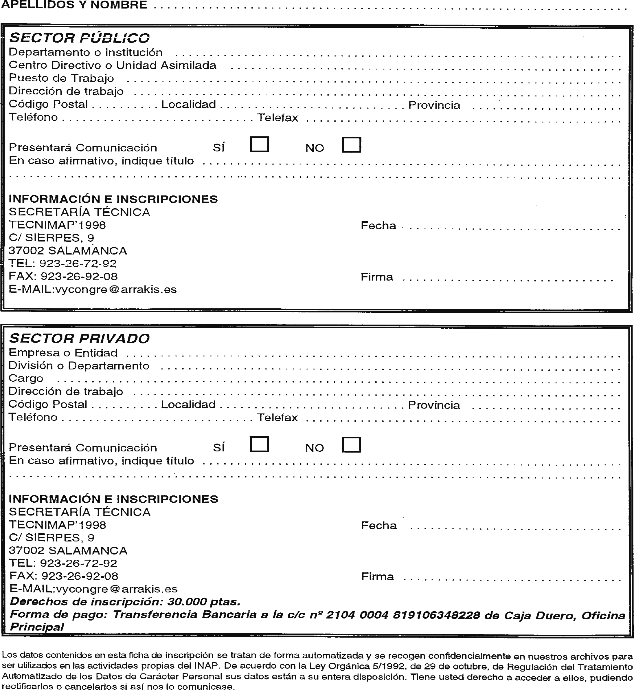 Las personas interesadas en participar que acrediten su pertenencia a cualquiera de las Administraciones públicas, ya sean la General del Estado, las de las Comunidades Autónomas o la Administración Local, incluyendo organismos autónomos y entes públicos, estarán exentas del pago de derechos de inscripción, pero deberán enviar una solicitud, en el formulario que aparece en el anexo 2, a la Secretaría Técnica de «Tecnimap’1998».