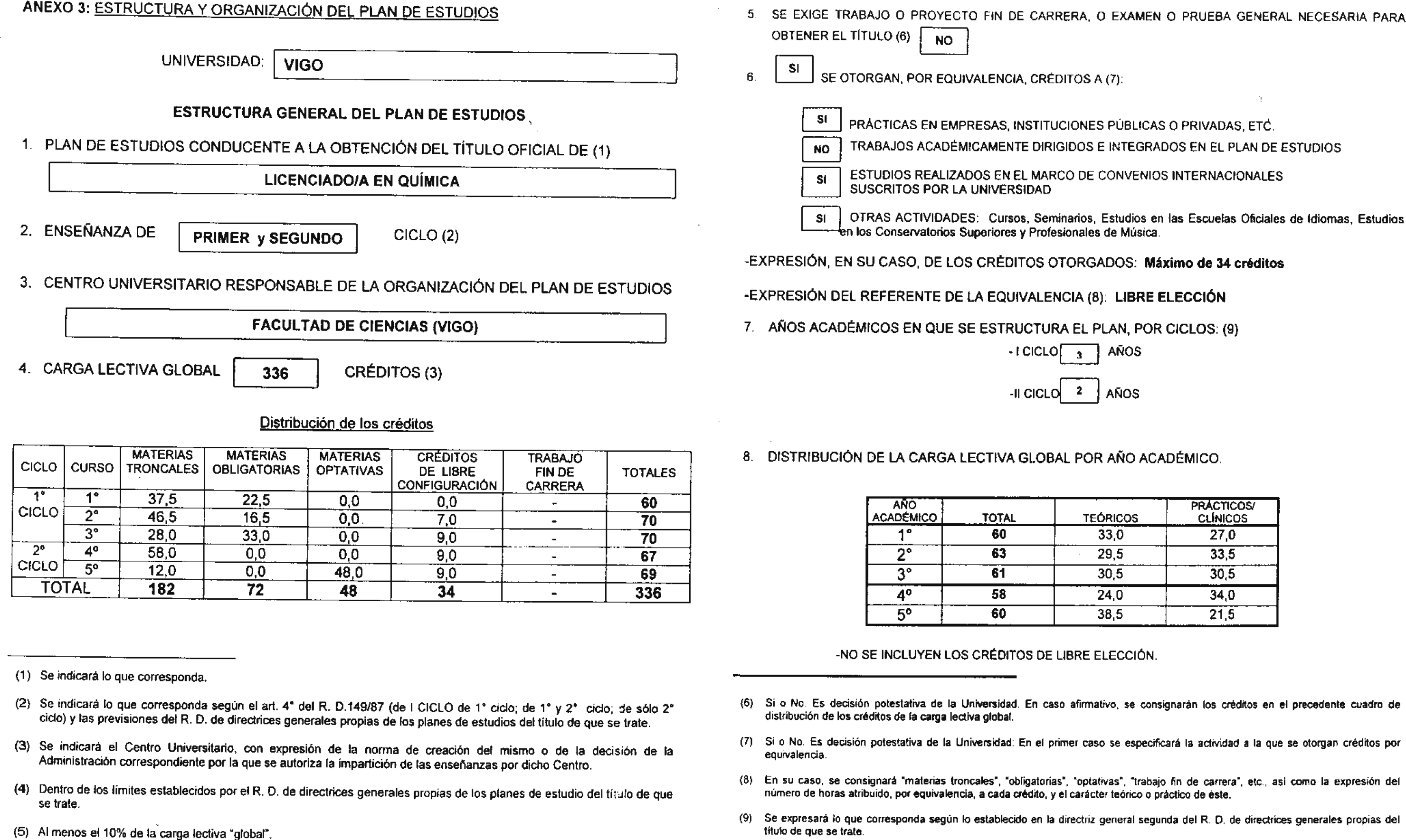 Homologado el plan de estudios de Licenciado en Química de la Universidad de Vigo por acuerdo de la Comisión Académica del Consejo de Universidades de 29 de junio de 2001,