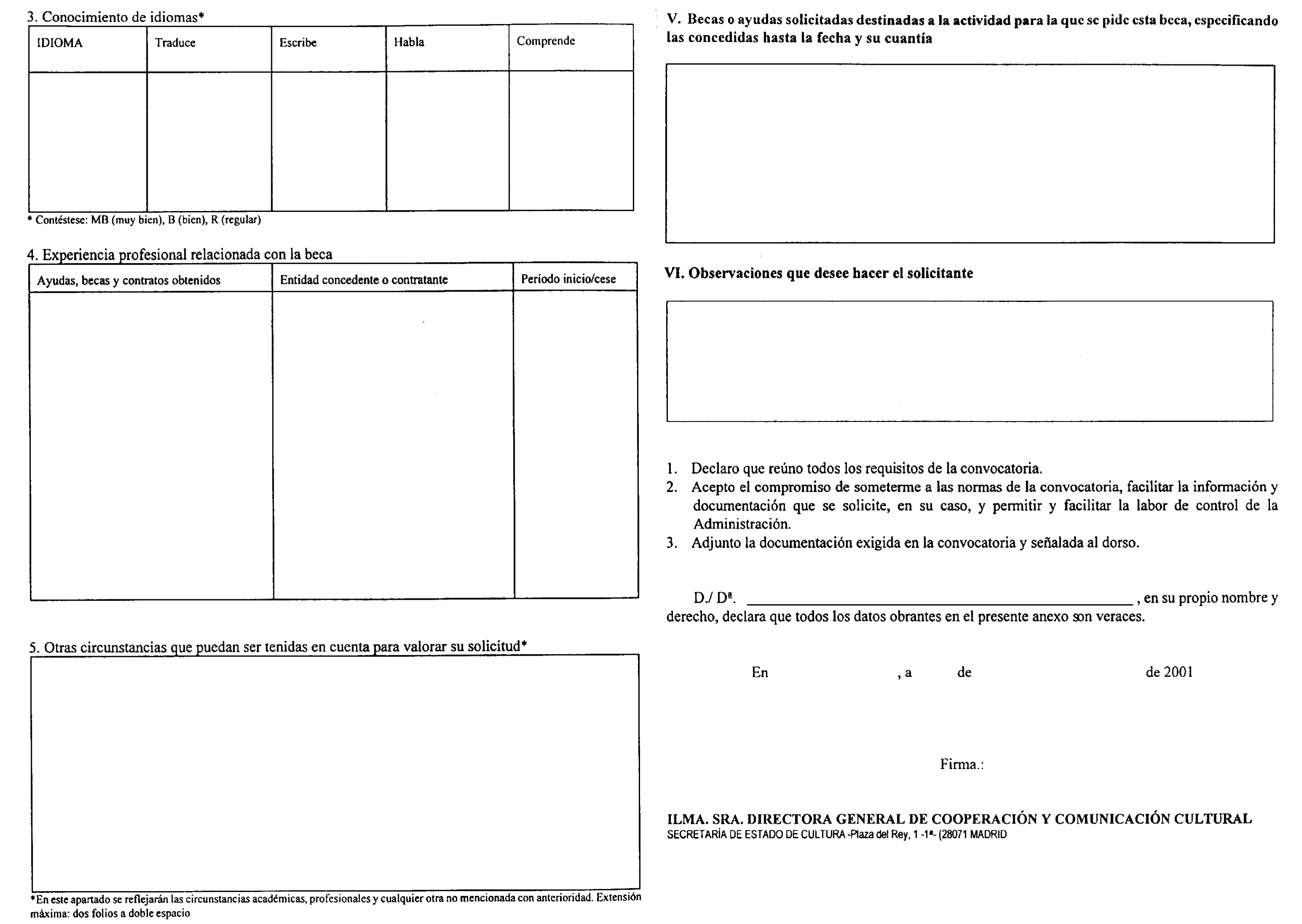 1. Las solicitudes, que se ajustarán al modelo que se publica como anexo VI a la presente Resolución, se cumplimentarán, enteramente a máquina o con letra de molde, en español, y deberán dirigirse a la Directora general de Cooperación y Comunicación Cultural.