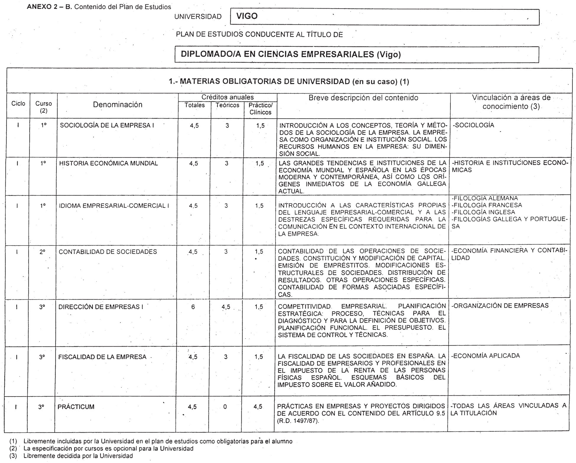 Resolución de 16 de noviembre de 2001, de la Universidad de Vigo, por la que se ordena la publicación de los planes de estudios conducentes a los títulos de Diplomado en Ciencias Empresariales y Maestro-especialidad en Educación Infantil y especialidad en Educación Primaria de la Escuela Universitaria de Profesorado de EGB (centro adscrito) de Vigo.