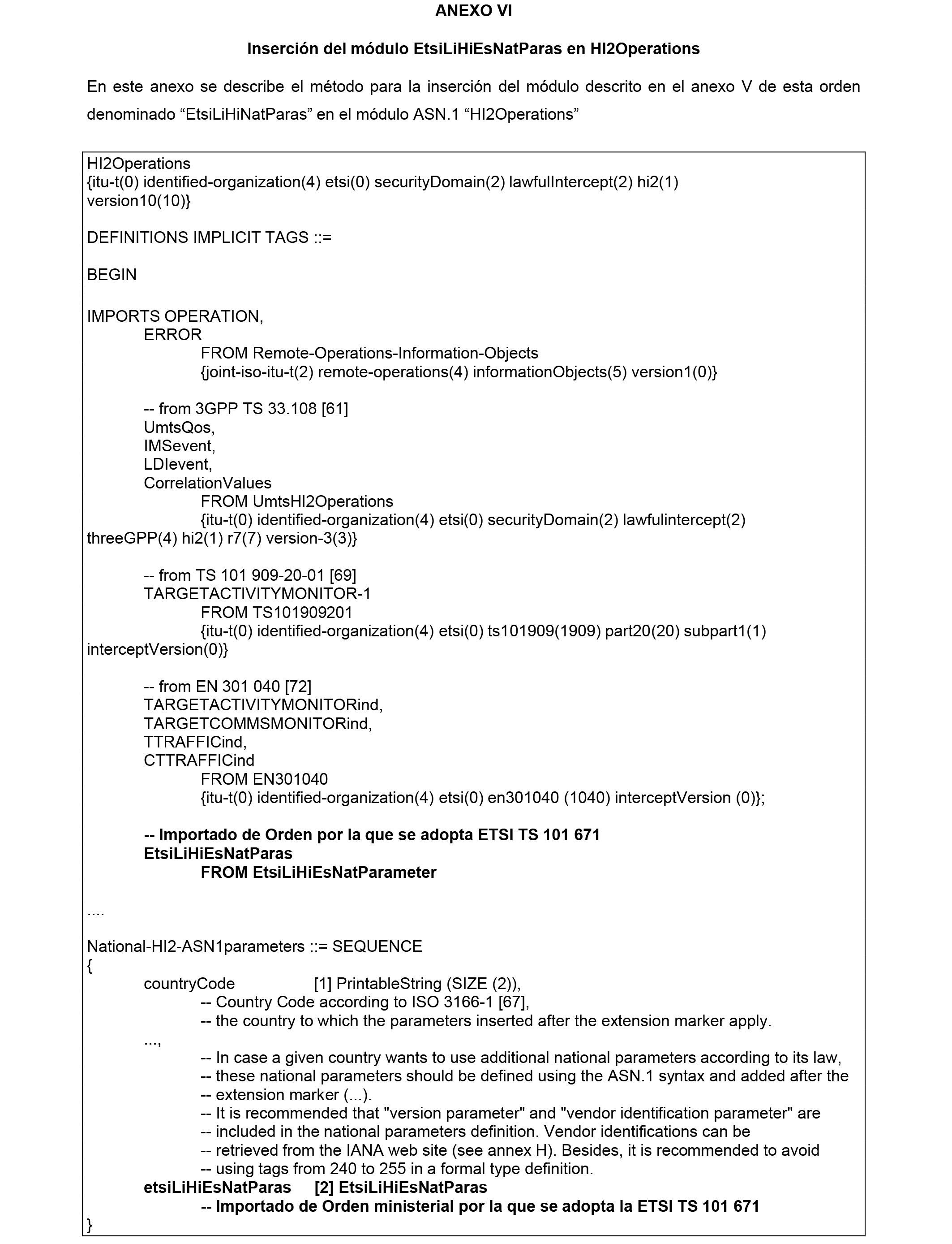 El procedimiento para la inserción del módulo mencionado en el párrafo anterior en el módulo ASN.1 «HI2Operations» está descrita en el anexo VI de esta orden.