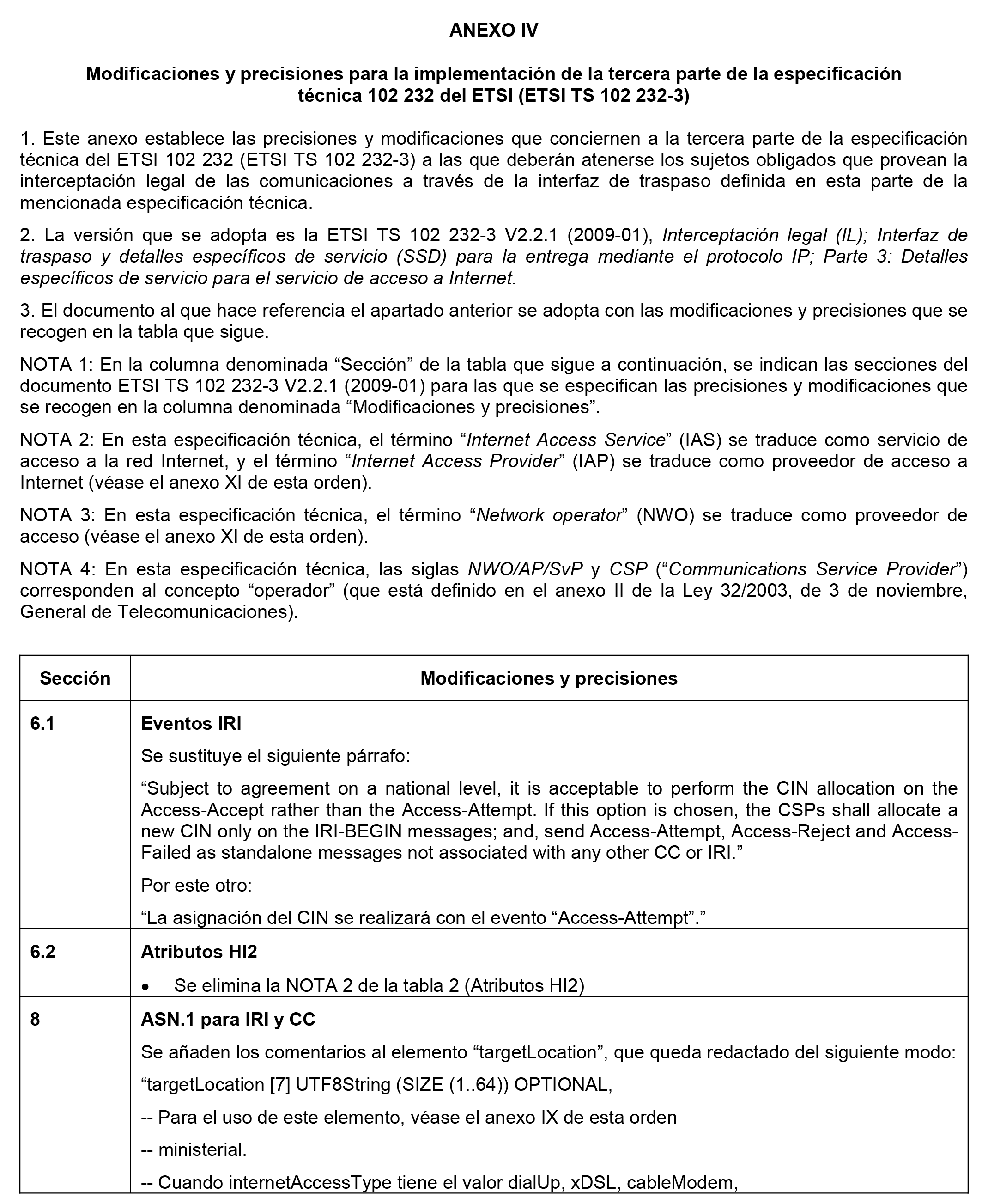 Mediante esta orden se adoptan varias de las partes de la especificación técnica del Instituto Europeo de Normalización de las Telecomunicaciones ETSI TS 102 232 «Interceptación Legal (IL); Interfaz de traspaso y detalles específicos del servicio (SSD) para la entrega mediante el protocolo IP».