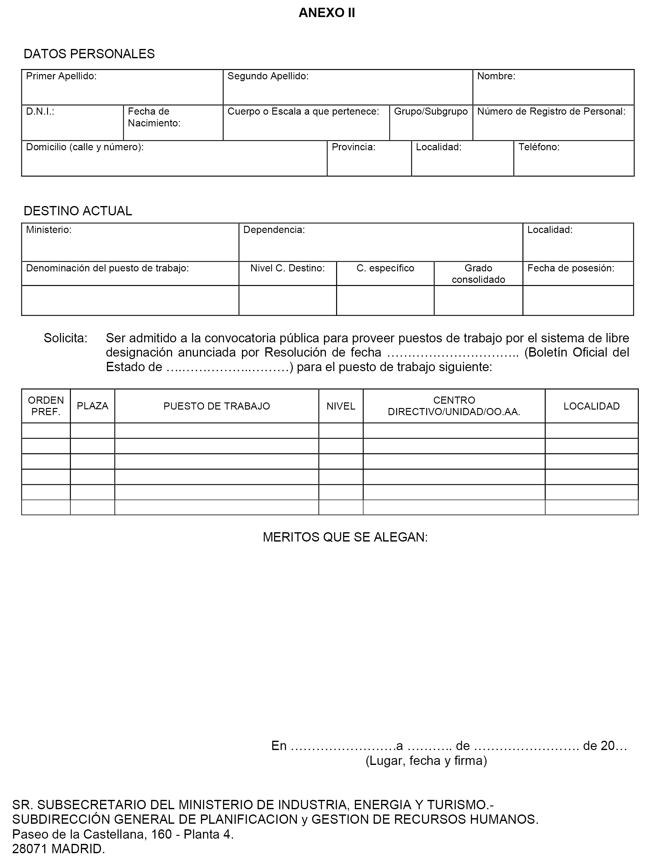Los interesados dirigirán sus solicitudes y las alegaciones de los méritos que se consideren oportunos al Sr. Subsecretario de Industria, Energía y Turismo (Subdirección General de Planificación y Gestión de Recursos Humanos), paseo de la Castellana, 160, planta 4, 28071 Madrid, en el anexo II que se adjunta, o a través de medios electrónicos mediante la cumplimentación de los modelos normalizados y preimpresos que aparecen en la siguiente dirección de Internet: www.minetur.gob.es, siguiendo los trámites concretos de gestión administrativa y los criterios específicos de utilización de técnicas electrónicas contenidos en el anexo III de esta convocatoria, de acuerdo con la Orden IET/1902/2012, de 6 de septiembre («Boletín Oficial del Estado» núm. 219, de 11 de septiembre de 2012), por la que se crea y regula el registro electrónico en este Ministerio.