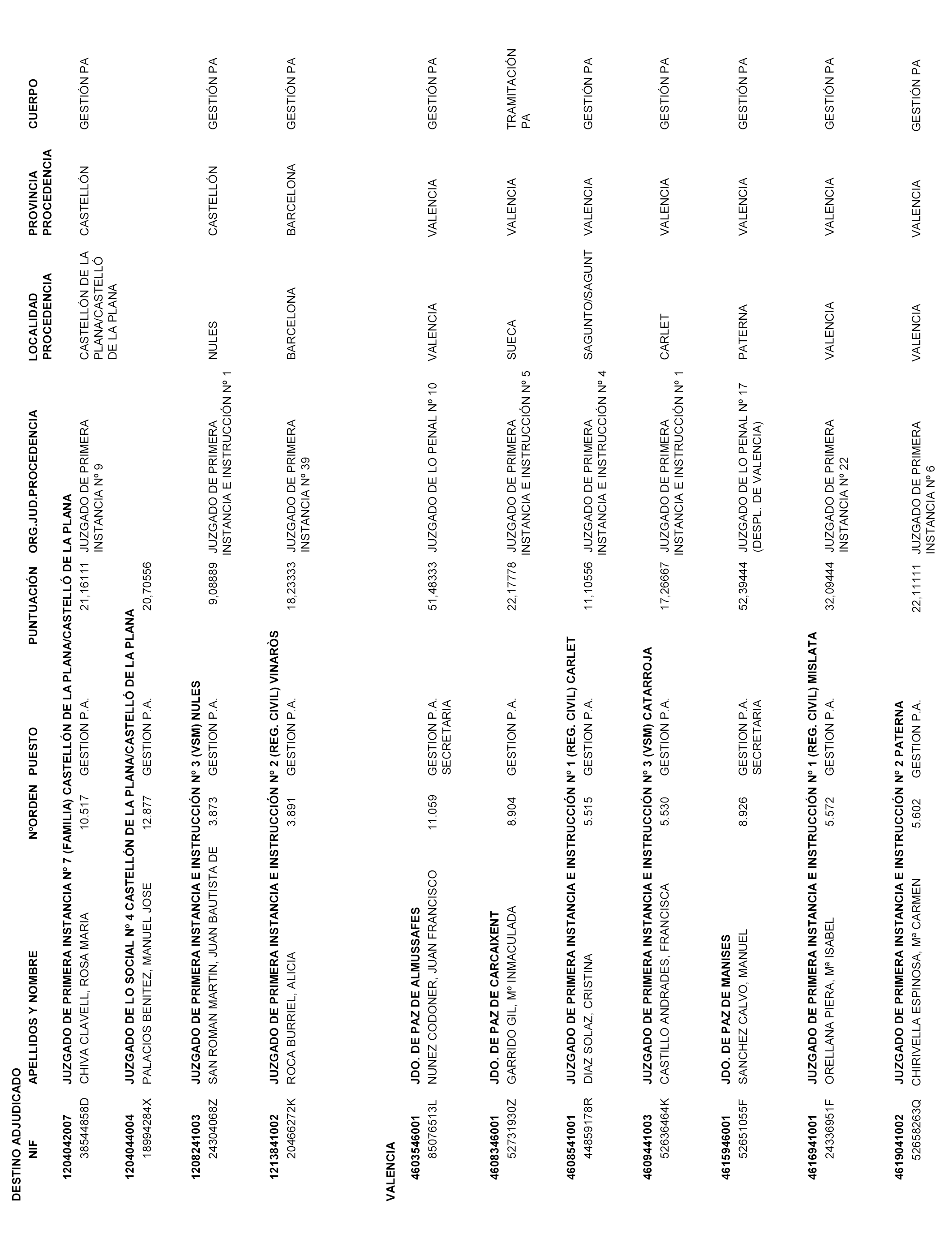 Resolución de 18 de octubre de 2016, de la Dirección General de Justicia, de la Conselleria de Justicia, Administraciones Públicas, Reformas Democráticas y Libertades Públicas, por la que se resuelve el concurso de traslado entre funcionarios de los Cuerpos y Escalas de Gestión Procesal y Administrativa, Tramitación Procesal y Administrativa y Auxilio Judicial de la Administración de Justicia, convocado por Resolución de 25 de abril de 2016.