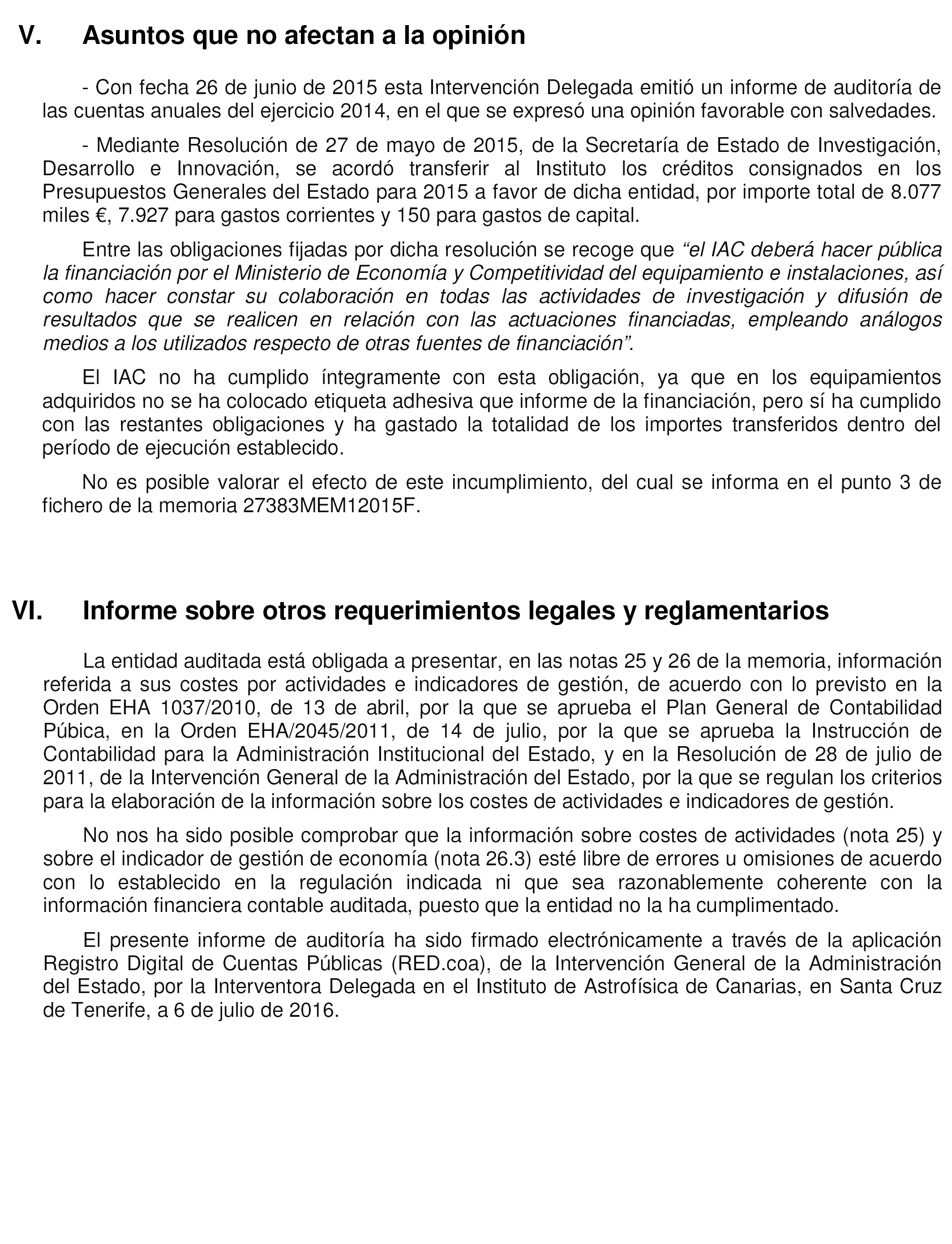 Por lo anterior, resuelvo que se publiquen las cuentas anuales del ejercicio 2015 del Instituto de Astrofísica de Canarias y el informe de auditoría para su general conocimiento.