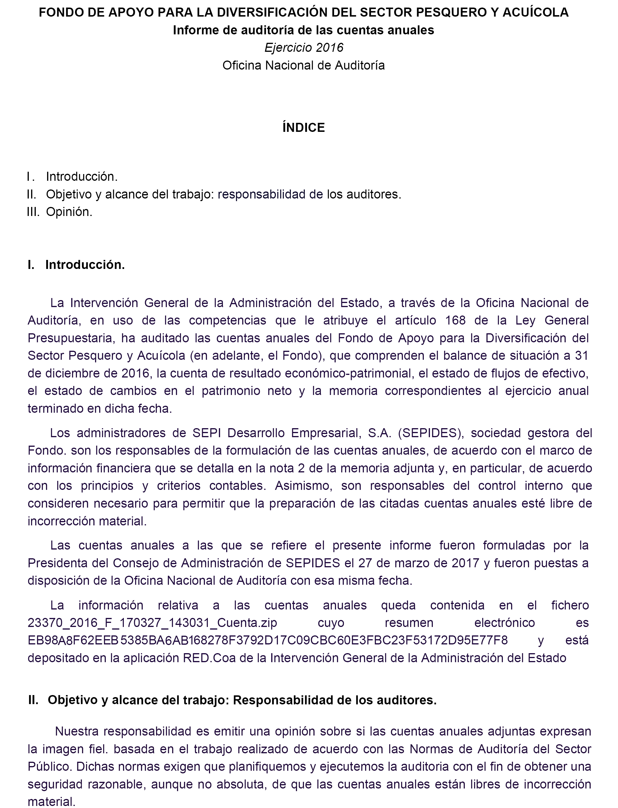 En cumplimiento de lo dispuesto en la Resolución de 12 de septiembre de 2013, de la Intervención General del Estado, por la que se regula el procedimiento de obtención, formulación, aprobación y rendición de las cuentas anuales para los fondos carentes de personalidad jurídica a que se refiere el apartado 2 del artículo 2 de la Ley General Presupuestaria, se hace público el resumen de las cuentas anuales del ejercicio 2016 del Fondo de Apoyo para la Diversificación del Sector Pesquero y Acuícola, para general conocimiento.