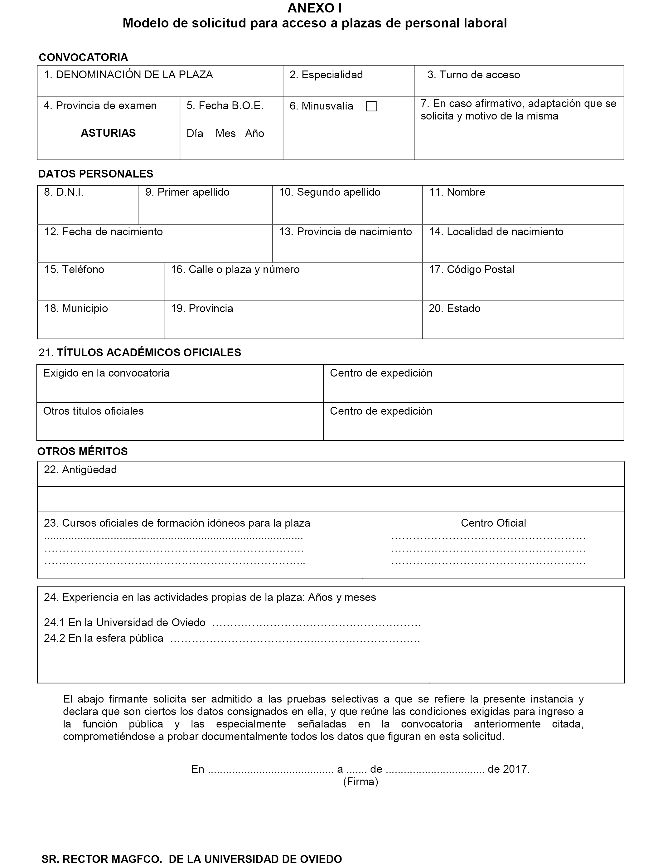 4.1 Quienes deseen tomar parte en estas pruebas selectivas, deberán solicitarlo mediante instancia, según modelo que figura como anexo I de esta convocatoria, que se presentará en el Registro General de la Universidad (Plaza de Riego, n.º 4, planta baja, Oviedo), en los Registros Auxiliares, cuyas sedes se encuentran ubicadas en el Servicio de Administración del Campus de Mieres, en el Servicio de Administración del Campus de Gijón, en el Servicio de Administración del Campus de El Cristo «A» de Oviedo (Aulario de Ciencias Jurídico-Sociales, Planta Baja, C/ Catedrático Valentín Andrés Álvarez), en el Centro de Servicios Universitarios de Avilés (C/ La Ferrería, n.º 7-9) y en el Servicio de Administración del Campus de El Milán (Calle Teniente Alfonso Martínez s/n, 33011, Oviedo) o en la forma establecida en el artículo 16 de la Ley 39/2015, de 1 de octubre, del Procedimiento Administrativo Común de las Administraciones Públicas, en el plazo de 20 días naturales contados a partir del siguiente al de la fecha de la publicación de esta convocatoria en el Boletín Oficial del Estado, y se dirigirán al Sr. Rector de la Universidad de Oviedo. Los sucesivos actos y resoluciones serán publicados en el BOPA y en la página web de la Universidad de Oviedo. La instancia se facilitará gratuitamente en el Registro General de la Universidad de Oviedo. De igual modo, el modelo de solicitud se encontrará disponible en el servidor de Internet de esta Universidad (http.//www.uniovi.es/pas/convocatorias/laboral/libre).