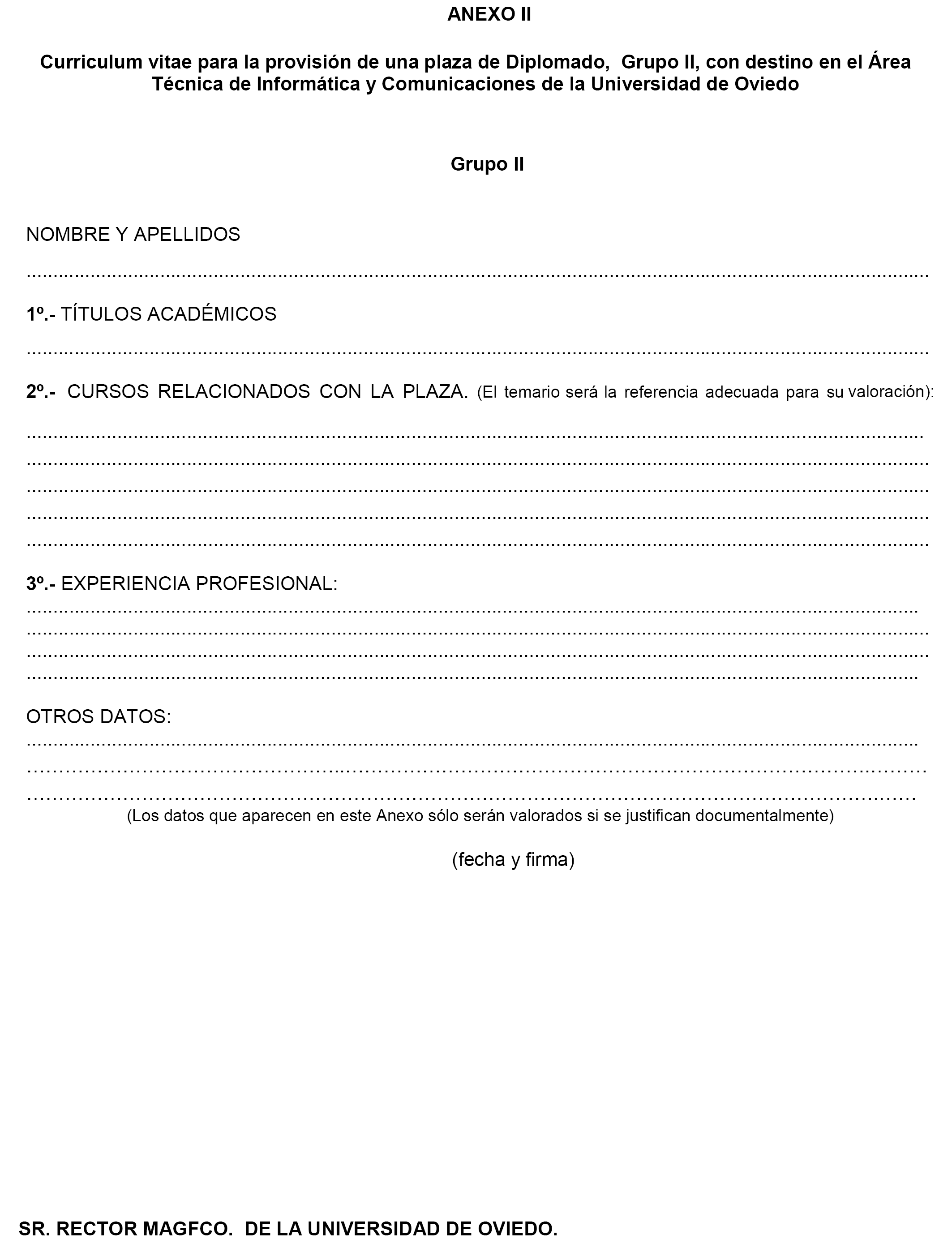 – Currículum Vitae según modelo que figura como Anexo II de esta convocatoria, cuyos datos y méritos será necesario justificar documentalmente, para su valoración en la fase de concurso.