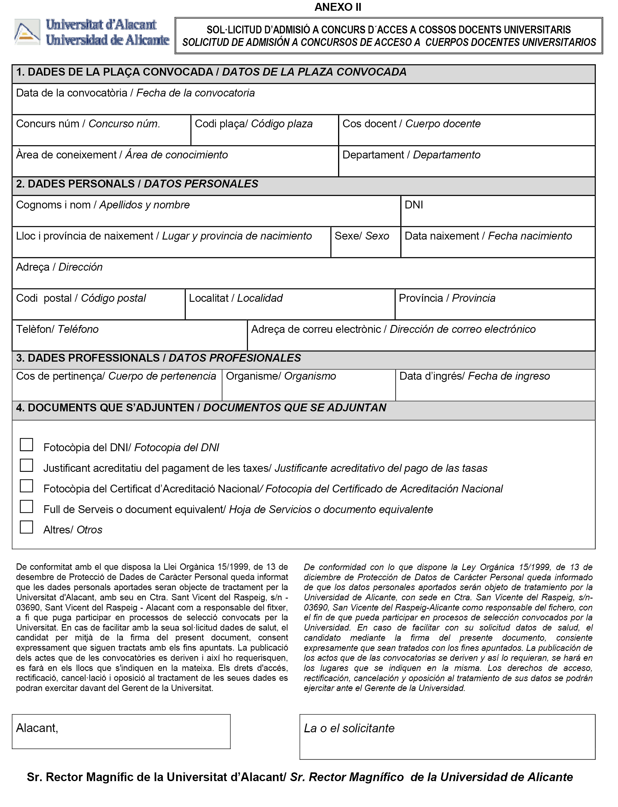Los datos de carácter personal aportados por las o los aspirantes quedarán incluidos en el fichero automatizado de Personal de esta Universidad, que se compromete a no hacer un uso distinto de aquel para el cual han sido solicitados, según la resolución de la Universidad de Alicante, de 18 de septiembre de 2013, sobre creación y modificación de ficheros de datos de carácter personal («DOGV» de 16 de octubre).