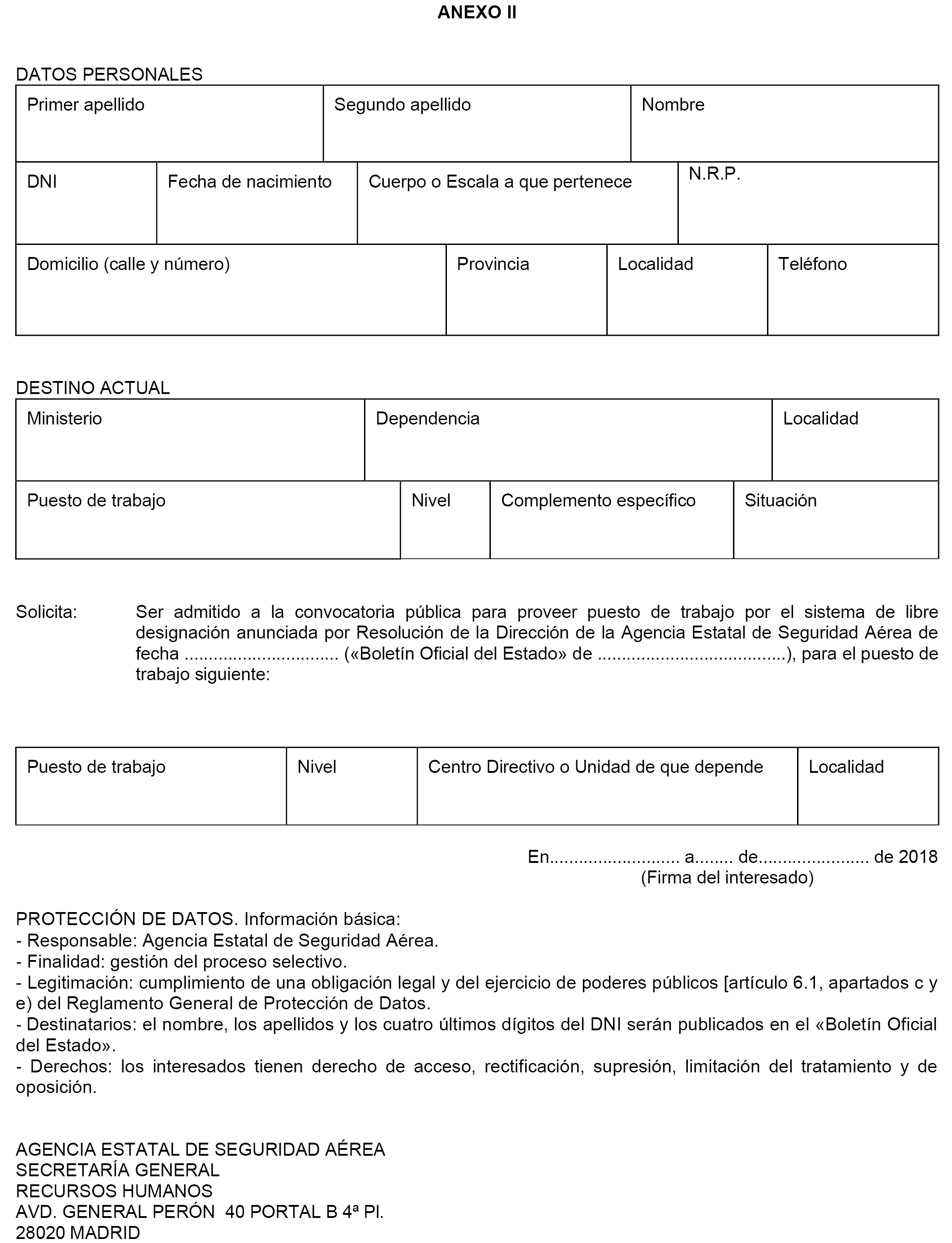 Las instancias para tomar parte en esta convocatoria se ajustarán al modelo que se publica como anexo II a esta resolución, debiendo presentarse dentro del plazo de quince días hábiles, contados desde el siguiente al de su publicación en el «Boletín Oficial del Estado», en el Registro de la Agencia Estatal de Seguridad Aérea (avenida General Perón, número 40, portal B, 1.ª planta, 28020 Madrid, en horario de 9:00 a 14:00 horas), en el Registro General del Ministerio de Fomento o por cualquiera de las formas que establece el artículo 16.4 de la Ley 39/2015, de 1 de octubre, de Procedimiento Administrativo Común de las Administraciones Públicas.