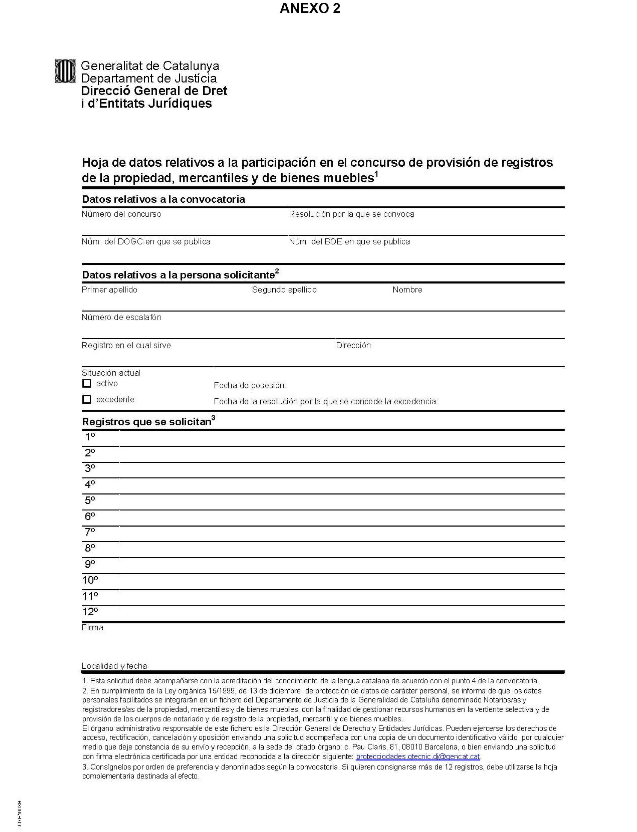 Si se opta por la presentación en el Registro electrónico de la Generalidad de Cataluña, es necesario presentar una solicitud telemática genérica dirigida a la Dirección General de Derecho y Entidades Jurídicas del Departamento de Justicia, disponible desde la web del Departamento de Justicia, a la que deben adjuntarse dos formularios específicos: la Hoja de datos relativos a la participación en el concurso de provisión de registros de la propiedad, mercantiles y de bienes muebles, y la Hoja de consignación de los registros que se solicitan (conforme a los modelos publicados en los anexos 2 y 3), disponibles también en la misma web, y la declaración jurada o el título acreditativo de conocimiento del catalán, de acuerdo con el punto 4 de esta Resolución.