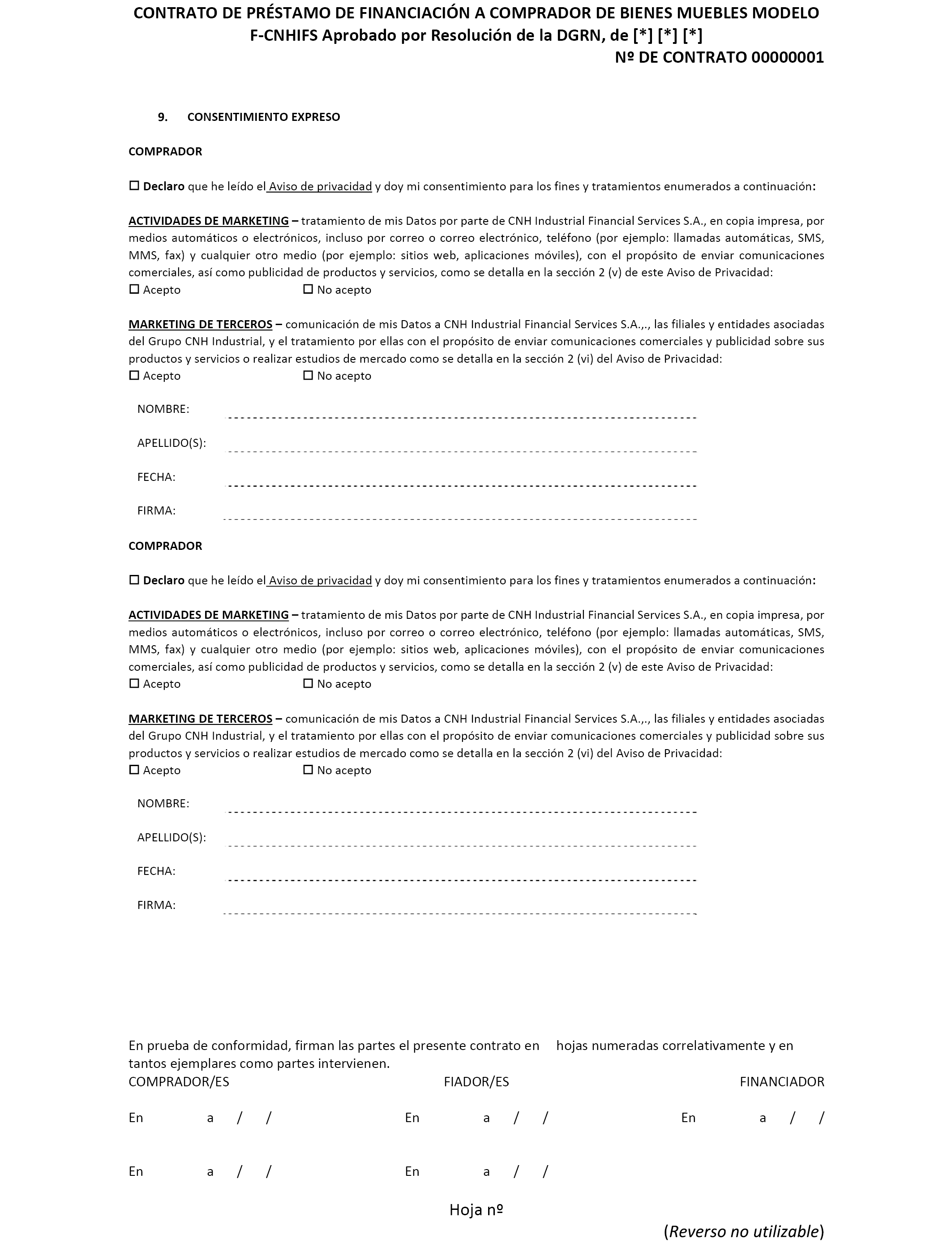 1.º Aprobar el modelo de contrato de préstamo de financiación a comprador de bienes muebles, letras de identificación «F-CNHIFS», y sus anexos I «Cuadro de amortización», y II «Indexación o modificación de las condiciones económicas», para ser utilizado por la entidad CNH Industrial Financial Services, Sucursal en España.