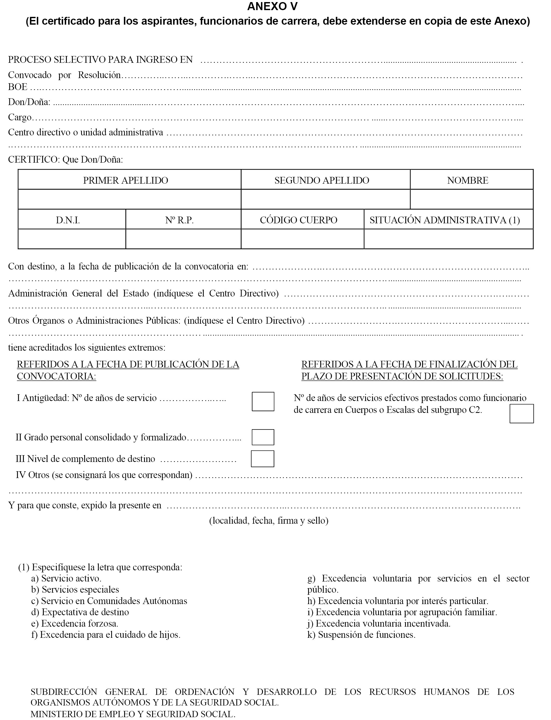 Finalizada la fase de oposición, los aspirantes que la hubieran superado dispondrán de un plazo de 20 días hábiles para presentar el certificado de requisitos y méritos expedido según lo previsto en el apartado Decimoctavo de la Orden HFP/688/2017, de 20 de julio. En el anexo V se incluye el modelo que debe cumplimentar el personal funcionario de carrera y en el anexo VI el modelo que corresponde al personal laboral fijo.