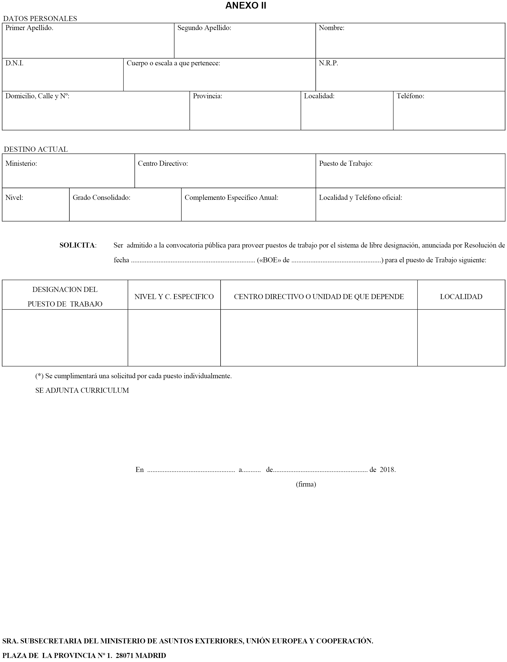 Las solicitudes se presentaran en el modelo de solicitud que figura como anexo II y se dirigirán en el plazo de quince días hábiles, a contar desde el siguiente al de la publicación de la presente Resolución en el «Boletín Oficial del Estado», a la señora Subsecretaria del Ministerio de Asuntos Exteriores y de Cooperación, plaza de la Provincia, núm. 1, Madrid. Las solicitudes y documentos que se envíen electrónicamente se encaminarán al código DIR3 «E04610101» de la Subdirección General de Personal de este Ministerio.