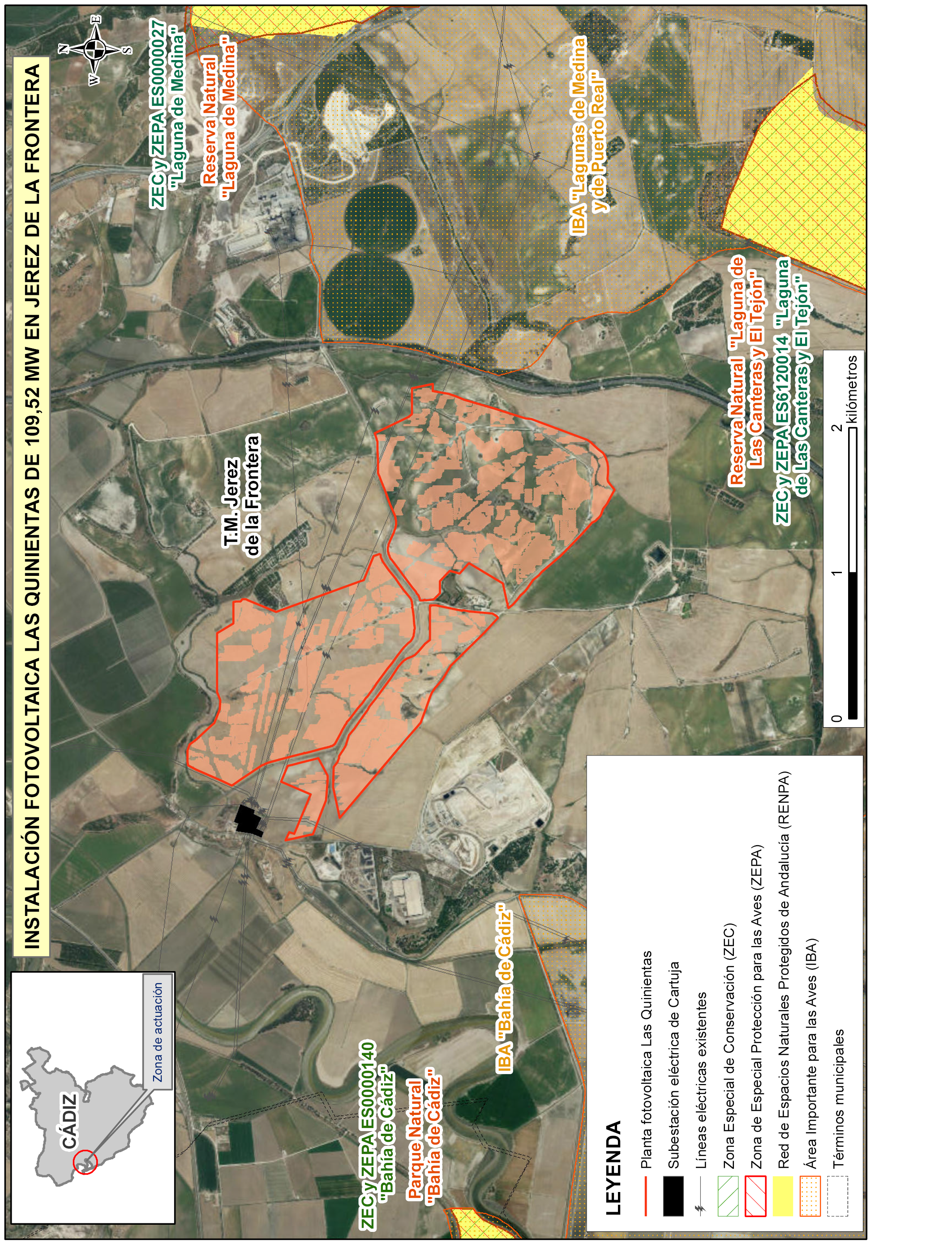 Espacios naturales protegidos: en el ámbito de actuación, fuera de la superficie ocupada por la instalación proyectada, se localizan los siguientes espacios incluidos en la Red Natura 2000 o en la Red de Espacios Naturales Protegidos de Andalucía (RENPA): zona especial de conservación (ZEC) y zona de especial protección para las aves (ZEPA) ES6120014 y reserva natural «Laguna de Las Canteras y El Tejón», ZEC y ZEPA ES0000027 y reserva natural «Laguna de Medina», y ZEC y ZEPA ES0000140 y parque natural «Bahía de Cádiz», los cuales comparten como principal objetivo común, la conservación de las aves acuáticas, el ZEC ES6120027 «Salado de San Pedro» que destaca principalmente por su función de corredor ecológico y por la presencia de salinete, y el ZEC ES6120030 «Cuevas de la Mujer y de Las Colmenas», con una importante colonia de quirópteros.