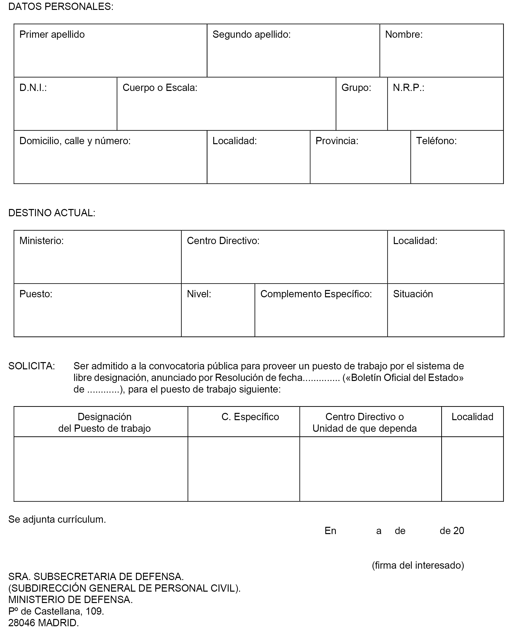 Los interesados dirigirán sus solicitudes, según modelo del anexo II, a la Sra. Subsecretaria de Defensa (Subdirección General de Personal Civil).
