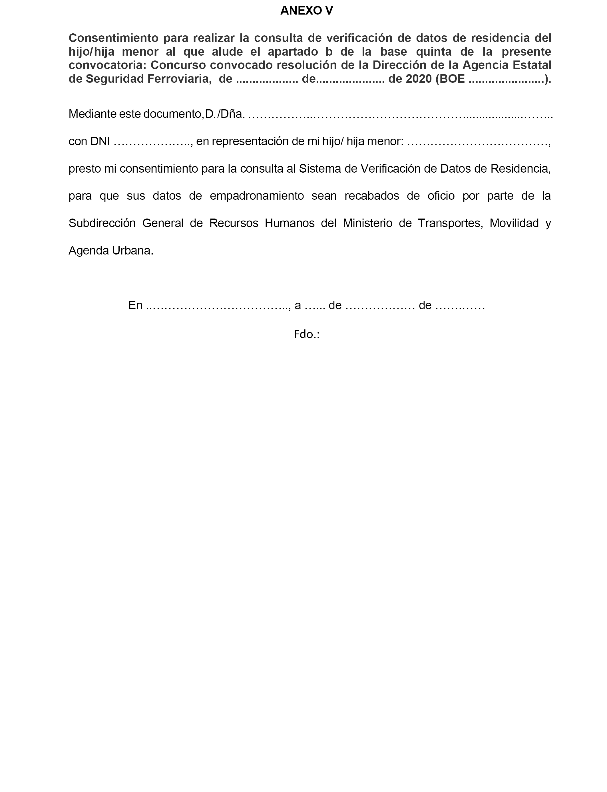 – Para los supuestos contemplados en el apartado 1.5.2.a) de la base cuarta, consentimiento fehaciente de la persona que concursa, en representación de su hijo o de su hija menor, para realizar la consulta al Sistema de Verificación de Datos de Residencia para que los datos de empadronamiento, exclusivamente en relación al hijo o la hija menor, sean recabados de oficio, mediante la cumplimentación del anexo V.