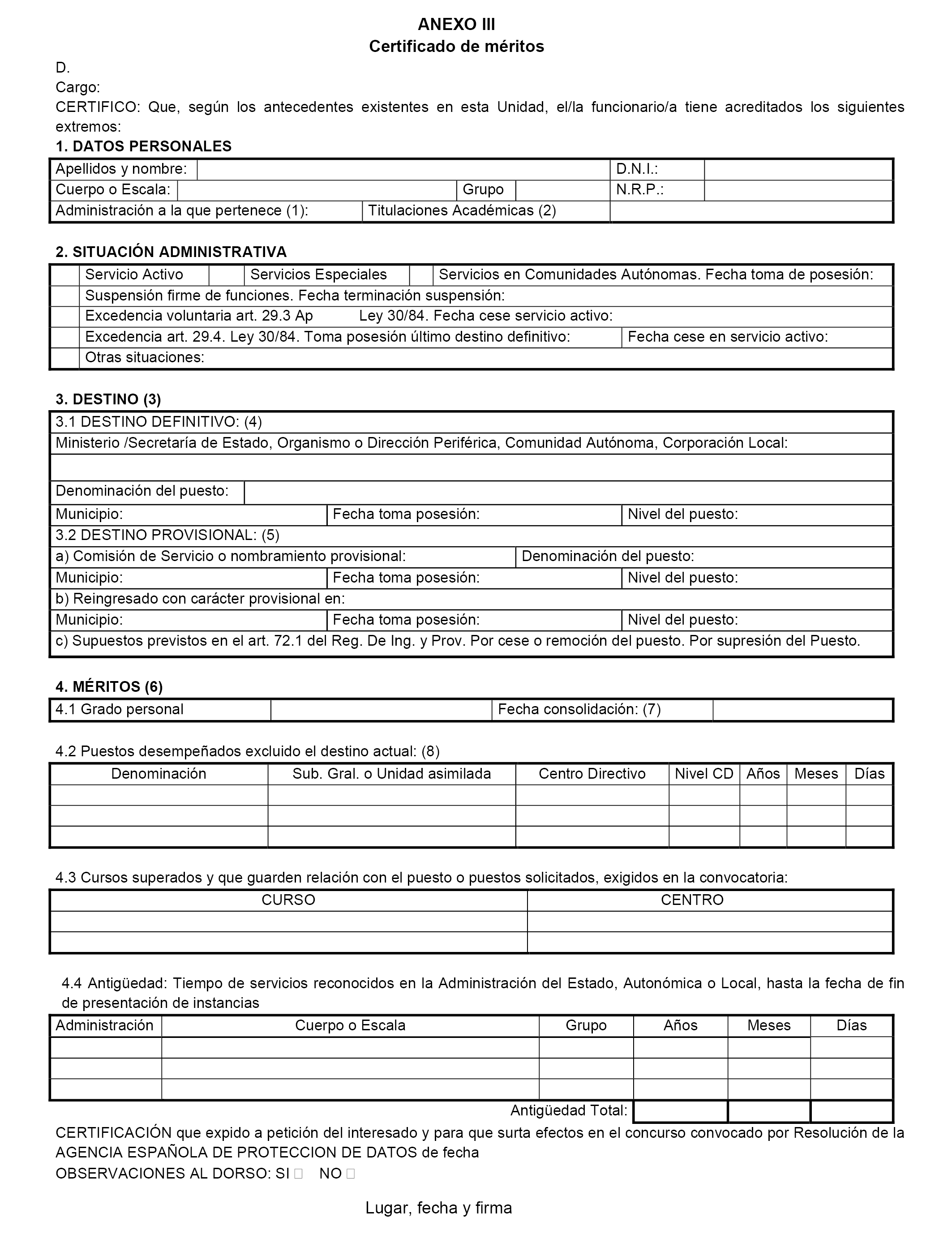 El anexo III de esta Resolución, recogerá aquellos méritos, requisitos y datos imprescindibles que en él se señalan y deberá ser expedido por: