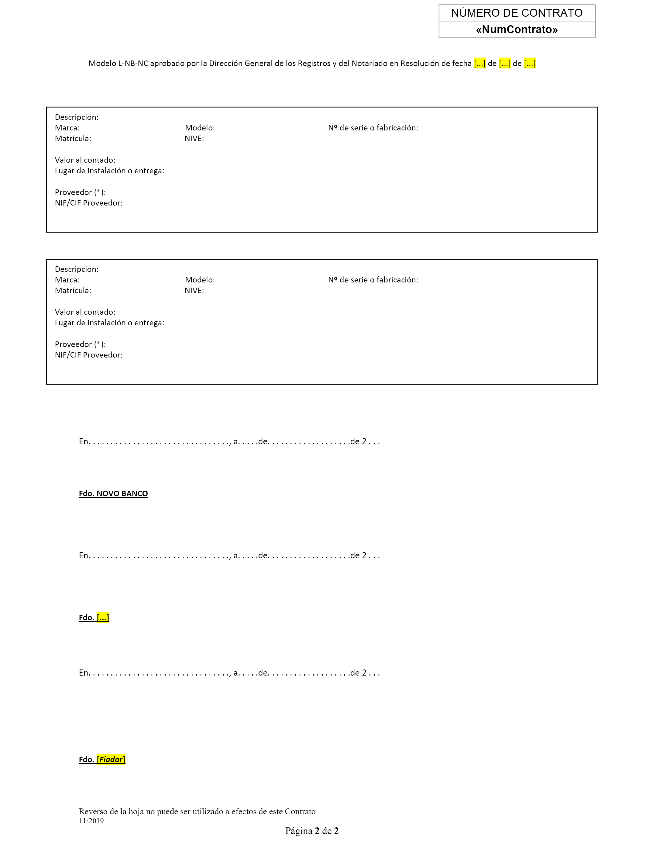 1.º Aprobar el modelo de contrato de arrendamiento financiero de bienes muebles, con letras de identificación «L-NB-NC», y sus anexos I «pagos y cuotas», II «cláusula de revisión del tipo de interés» y III «descripción de los bienes objeto del contrato», para ser utilizado por la entidad Novo Banco, S.A. Sucursal en España.