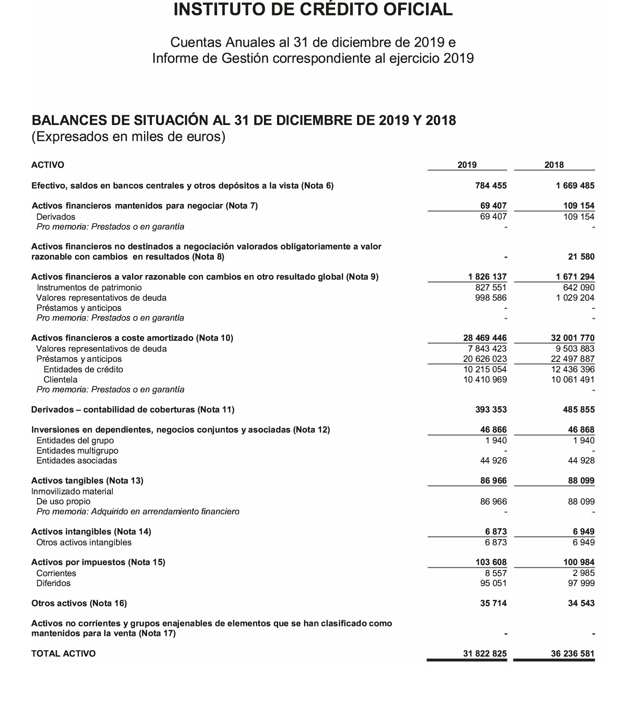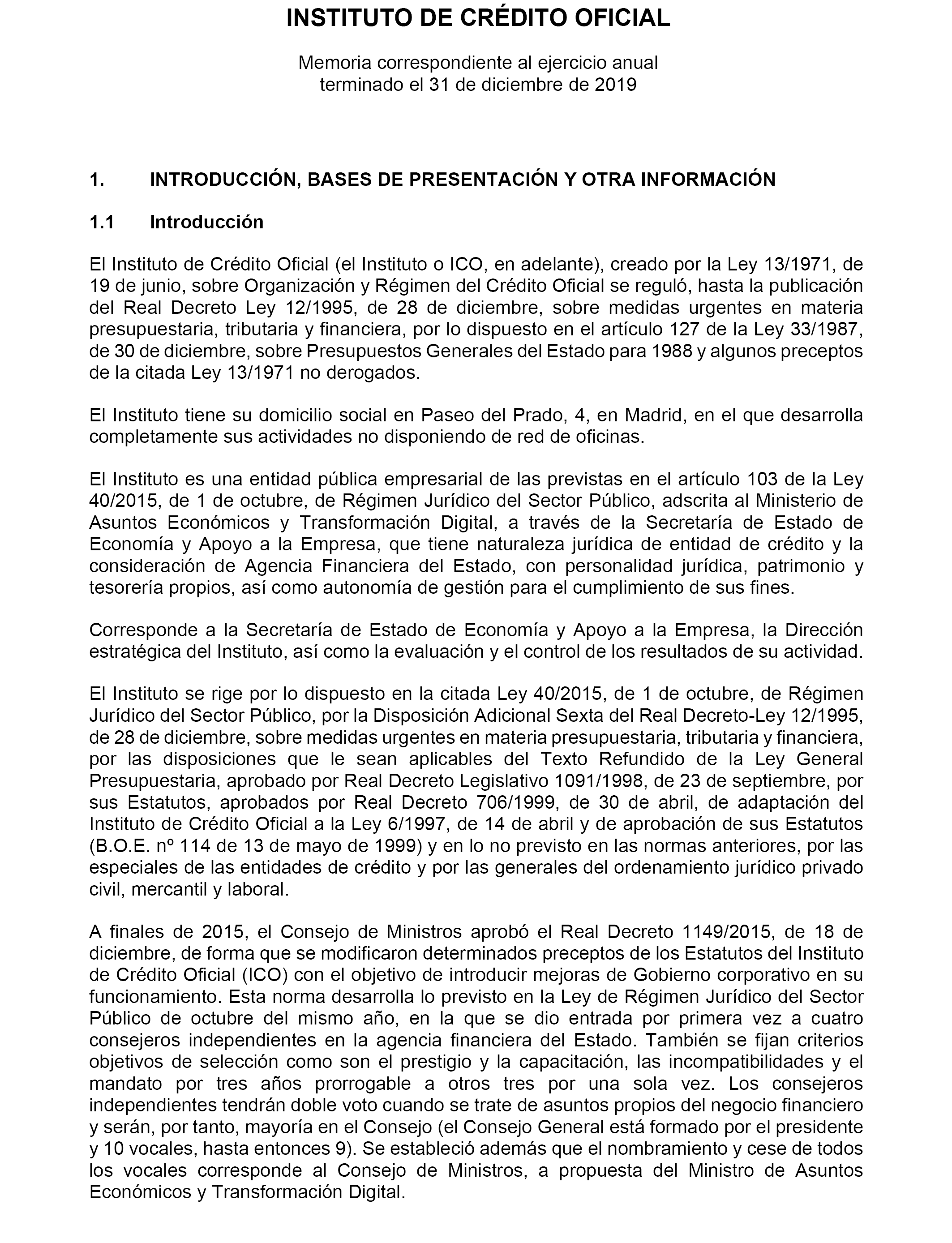 De conformidad con lo dispuesto en el artículo 136 de la Ley 47/2003, de 26 de noviembre, General Presupuestaria y en el dispositivo Tercero de la Resolución de 3 de junio de 2013, de la Intervención General de la Administración del Estado, por la que se determina el contenido mínimo de la información a publicar en el «Boletín Oficial del Estado» por las entidades del sector público estatal empresarial y fundacional que no tengan obligación de publicar sus cuentas anuales en el Registro Mercantil, y que a su vez deban formular cuentas anuales consolidadas, se hacen públicas, a efectos de su inserción en el «Boletín Oficial del Estado», las Cuentas Anuales Individuales del Instituto de Crédito Oficial, con su informe de auditoría, realizado en el ejercicio 2020, que figuran como anexo a esta resolución, correspondientes a las cuentas anuales del año 2019.