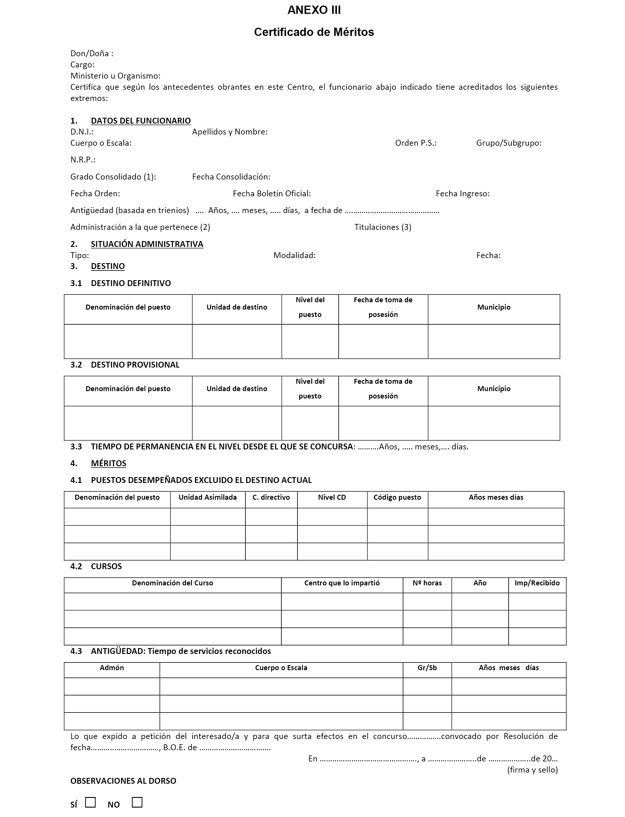 Los méritos generales se acreditarán en el certificado de méritos (anexo III), que recogerá aquellos méritos, requisitos y datos imprescindibles que en él se señalan y deberá ser expedido de acuerdo con los siguientes supuestos: