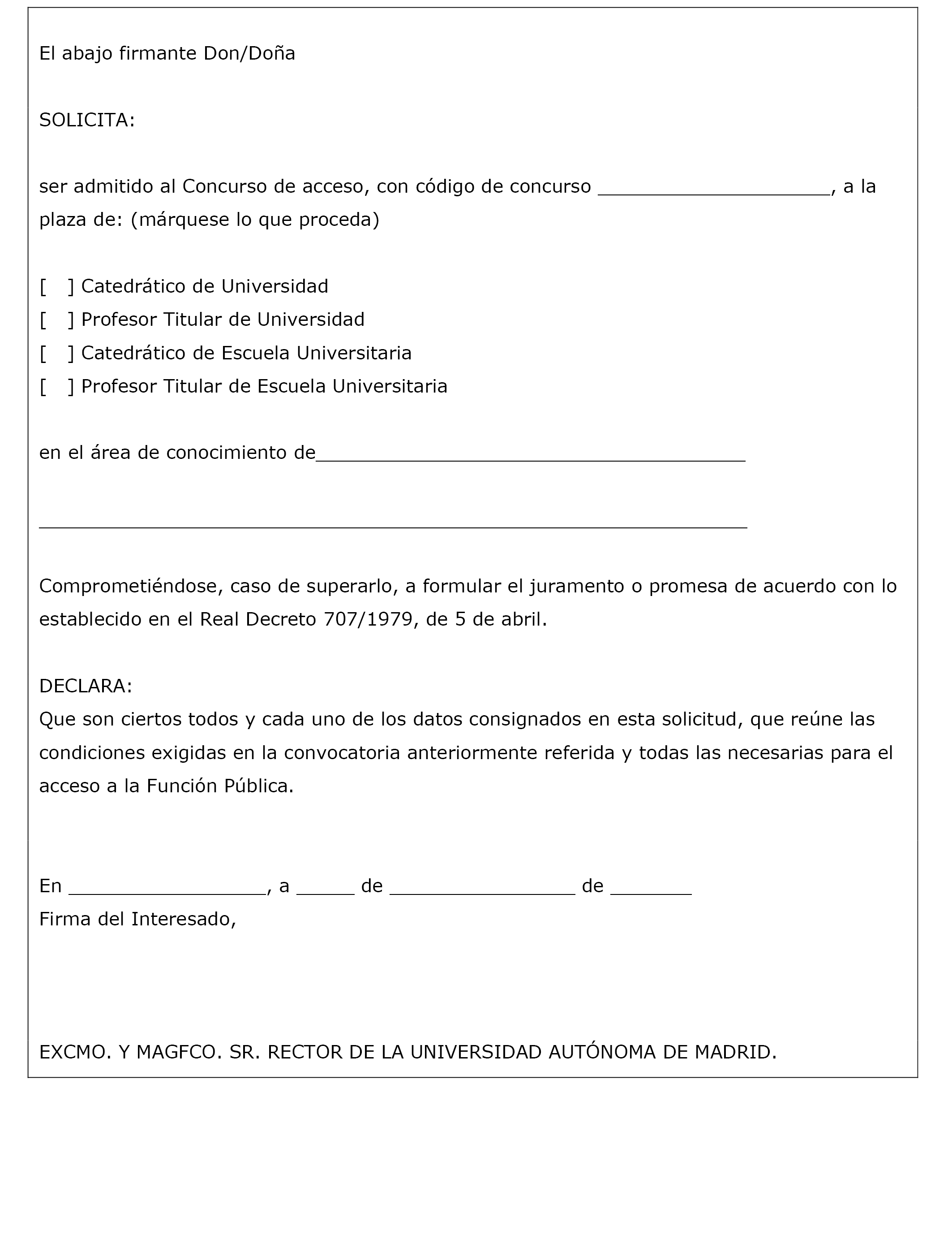 2.1 Quienes deseen tomar parte en el concurso de acceso presentarán la correspondiente solicitud al Rector de la Universidad Autónoma de Madrid, según el modelo que acompaña a la presente Resolución en el anexo II, dirigiéndola al Registro General de la Universidad Autónoma de Madrid, situado en el Edificio del Rectorado, ctra. Colmenar Viejo, km 15.500, c/ Einstein, n.º 3, 28049, Madrid, o en cualquiera de los lugares establecidos en el artículo 16.4 de la Ley 39/2015, de 1 de octubre, del Procedimiento Administrativo Común de las Administraciones Públicas, en el plazo de veinte días naturales a partir del siguiente al de la publicación de la presente convocatoria en el «Boletín Oficial del Estado», junto con los siguientes documentos: