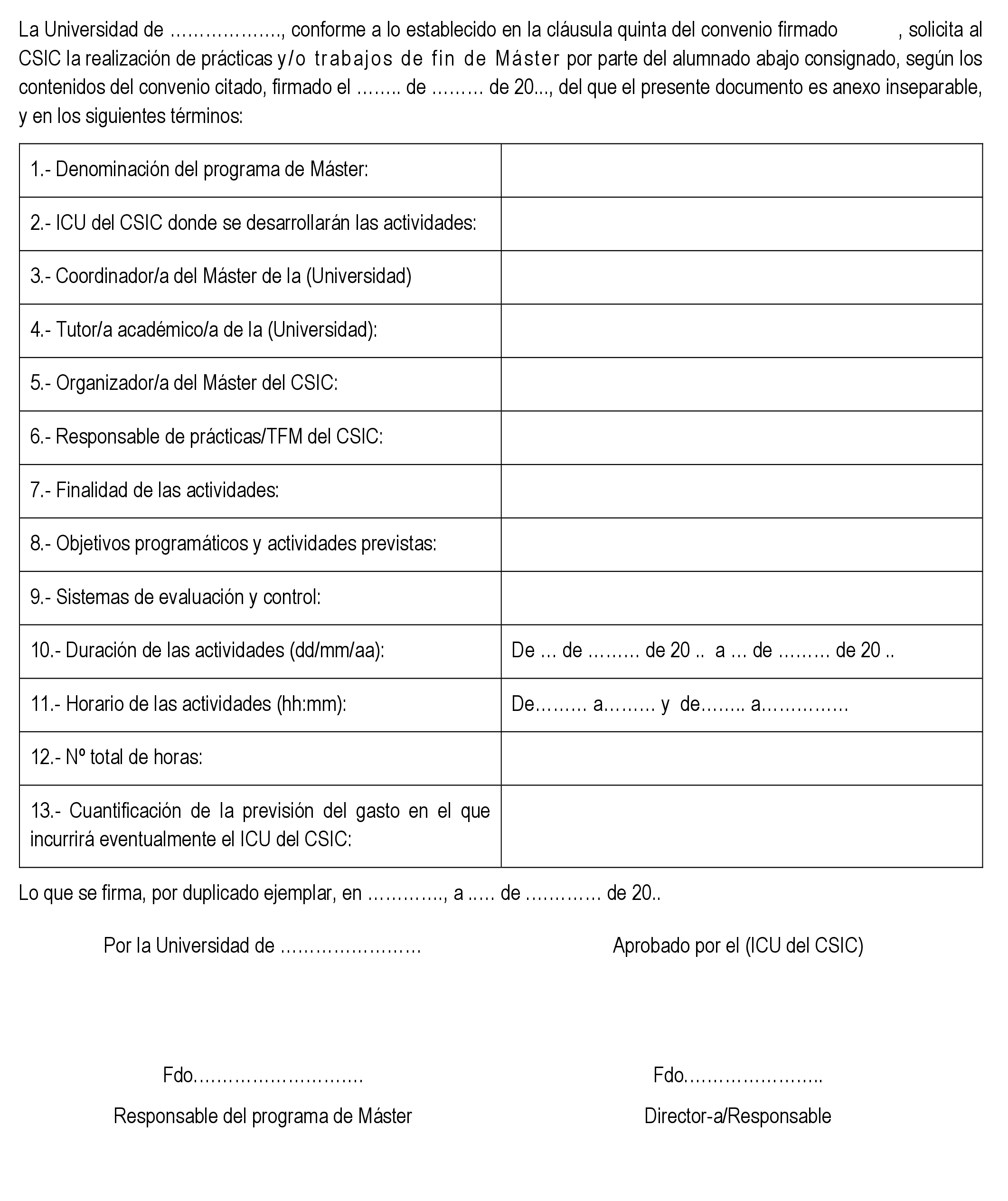 1.º La Universidad, a efectos de poder incluir a los ICU del CSIC dentro de su oferta de prácticas externas asociada a alguno de sus títulos, deberá solicitarlo mediante la presentación al CSIC del Anexo I de este Convenio, que se incorporarán al mismo, y que será firmado por la persona competente en la Universidad.
