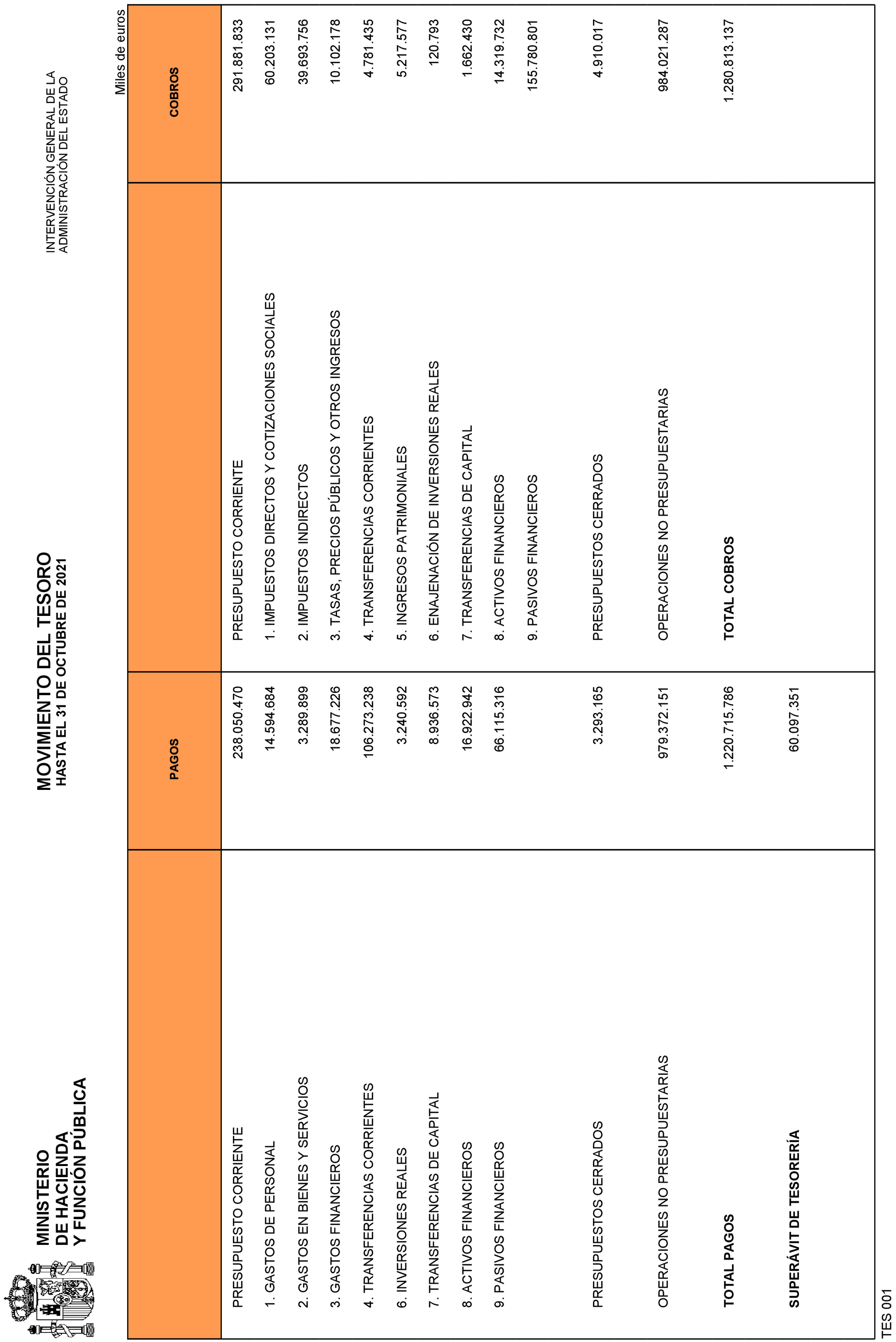 En aplicación de lo dispuesto en el artículo 136 de la Ley General Presupuestaria se hacen públicas las Operaciones de ejecución del Presupuesto del Estado y de sus modificaciones y operaciones de Tesorería correspondientes al mes de octubre de 2021.
