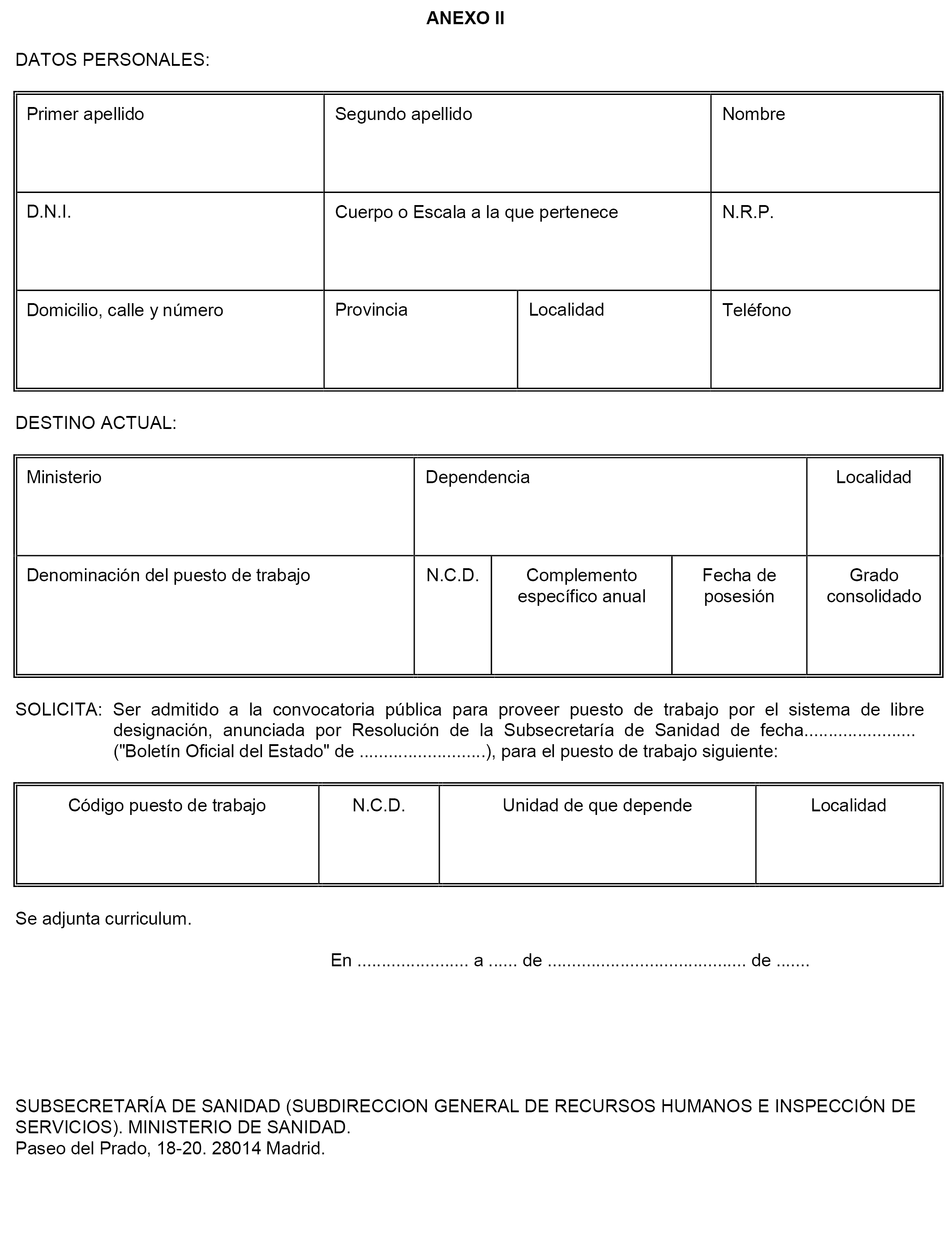Los interesados dirigirán sus solicitudes a la Subsecretaría de Sanidad (Subdirección General de Recursos Humanos e Inspección de Servicios) paseo del Prado, 18-20, 28014 Madrid, ajustándose al modelo publicado como anexo II de la presente Resolución, y se presentarán en el Registro General del Departamento en el plazo de quince días hábiles, a contar desde el día siguiente al de la publicación de la presente convocatoria en el «Boletín Oficial del Estado», o en los lugares a que se refiere el artículo 16 de la Ley 39/2015, de 1 de octubre, del Procedimiento Administrativo Común de las Administraciones Públicas.
