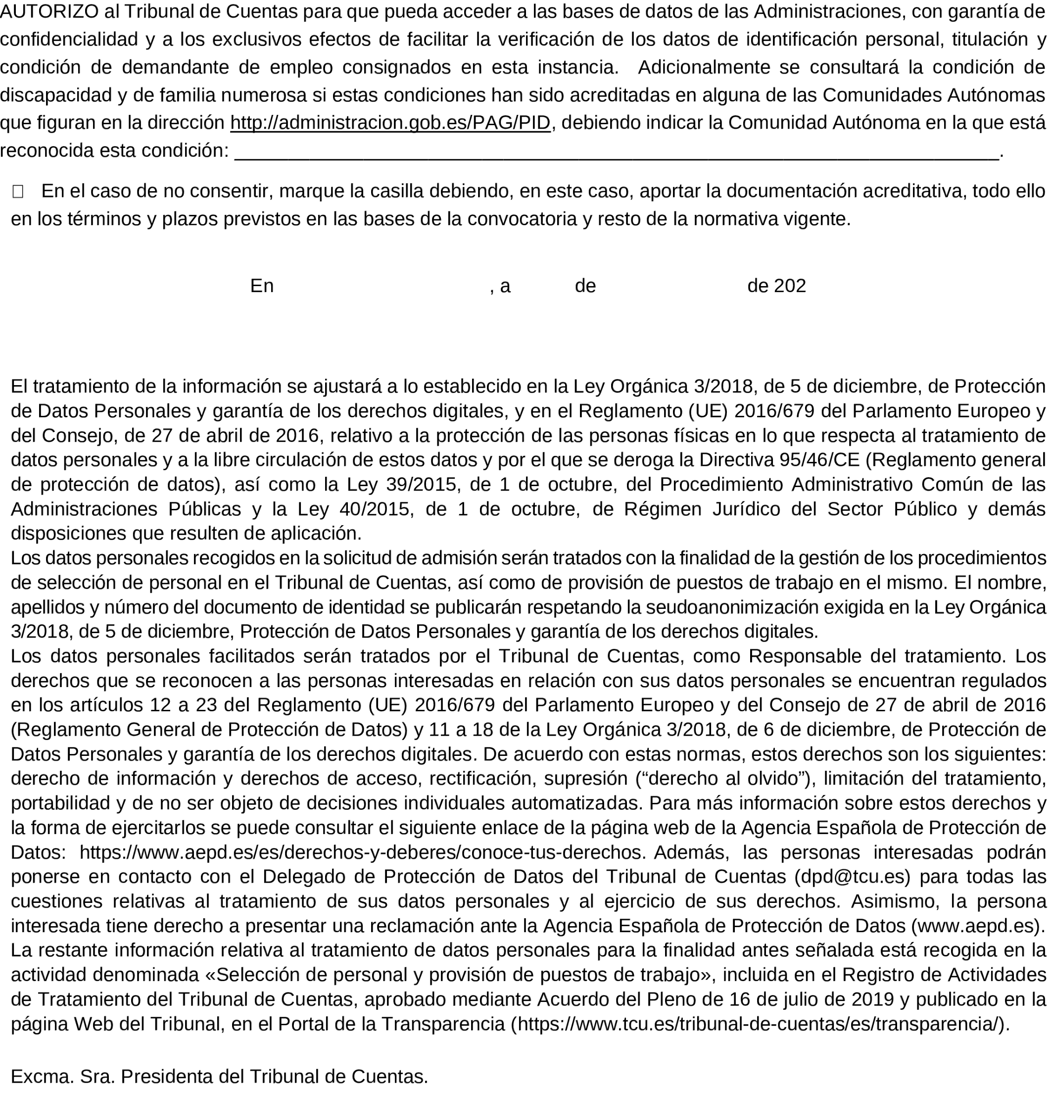 6.6 Los datos de carácter personal facilitados por quienes participen en este proceso selectivo serán tratados por el Tribunal de Cuentas de conformidad con lo dispuesto en el Reglamento General de Protección de Datos [Reglamento (UE) 2016/679, del Parlamento Europeo y del Consejo de 27 de abril del 2016], en la Ley Orgánica 3/2018, de 5 de diciembre, de Protección de Datos Personales y garantía de derechos digitales, y en las demás normas complementarias que resulten aplicables.