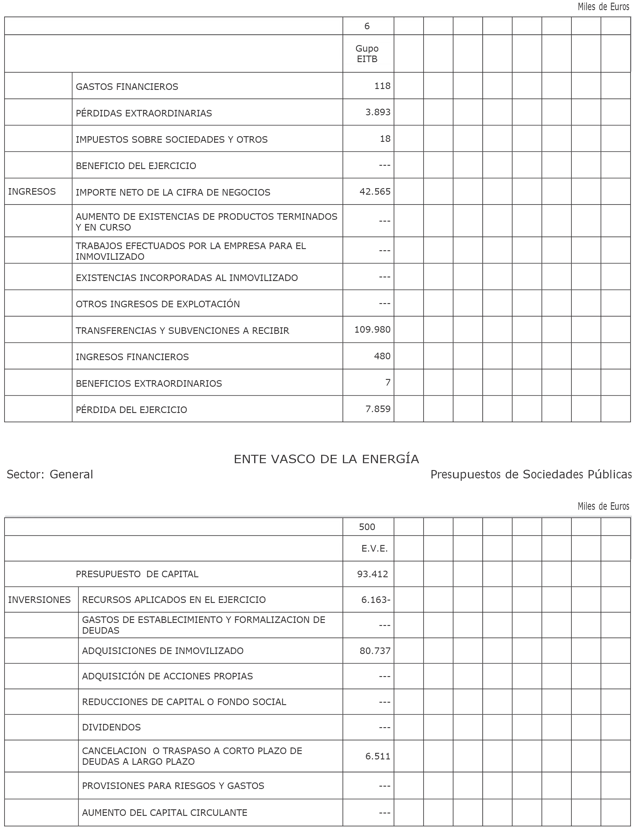 En los presupuestos de explotación y de capital del Ente Vasco de la Energía se aprueban dotaciones por importes de 13.298.535 euros y de 93.411.816 euros, respectivamente, estimándose los recursos en idénticas cuantías.